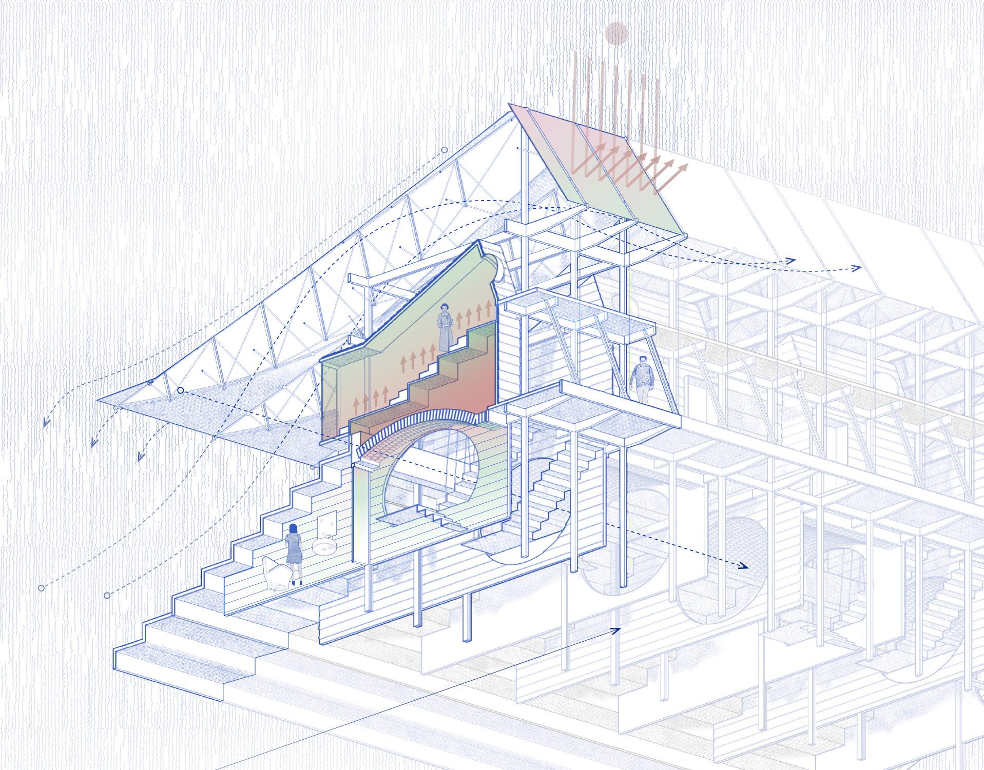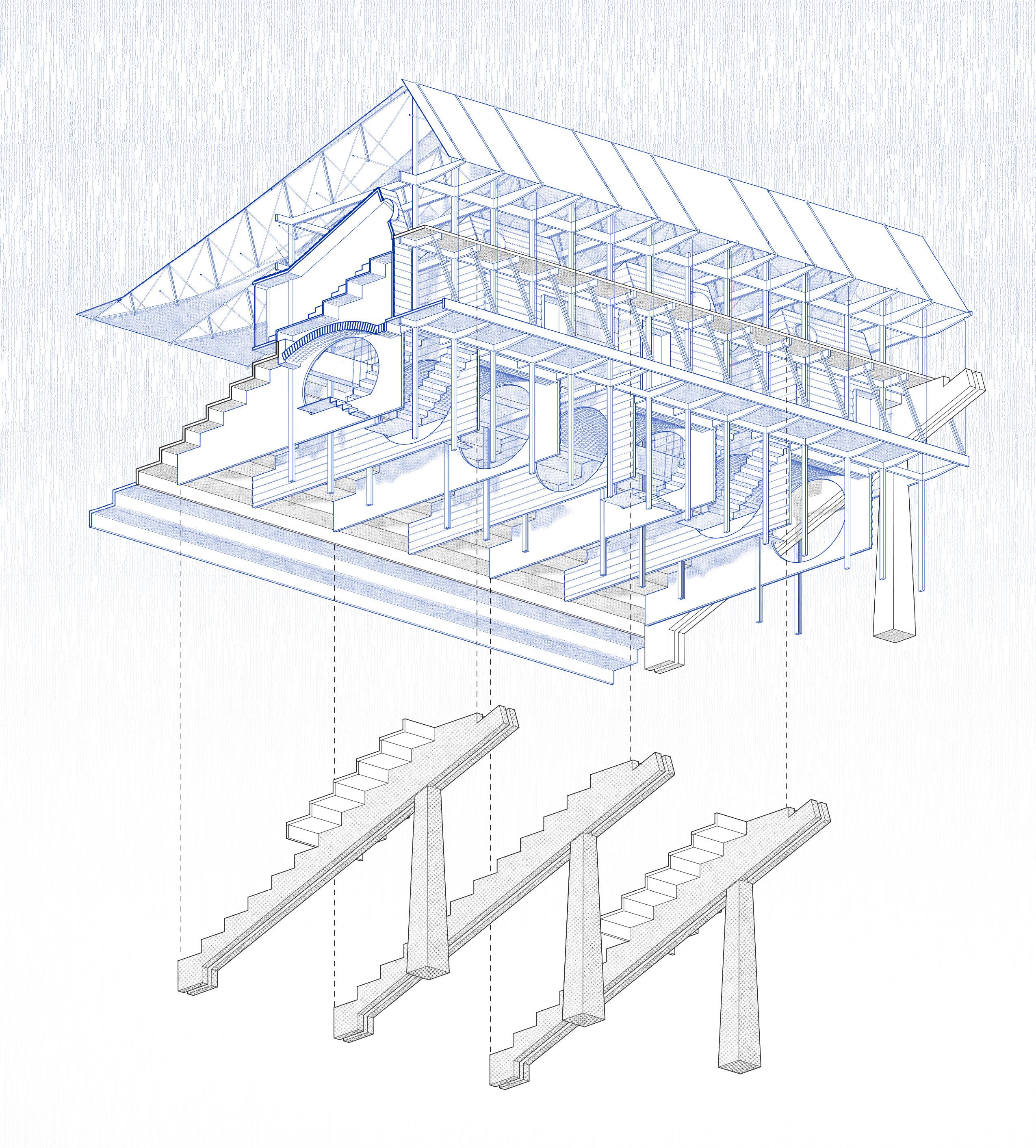The existing bleacher structure utilizes a simply supported concrete beam system, capped by a steel foil roof slanted toward the rear for drainage. This configuration overlooks the spatial potential beneath the seating area, which remains underutilized and disconnected from user activity concentrated at the stage front. A comprehensive makeover is required to holistically integrate this vacant volume, transforming it into functional space while incorporating a functionally sustainable system for an ecologically responsive facility.