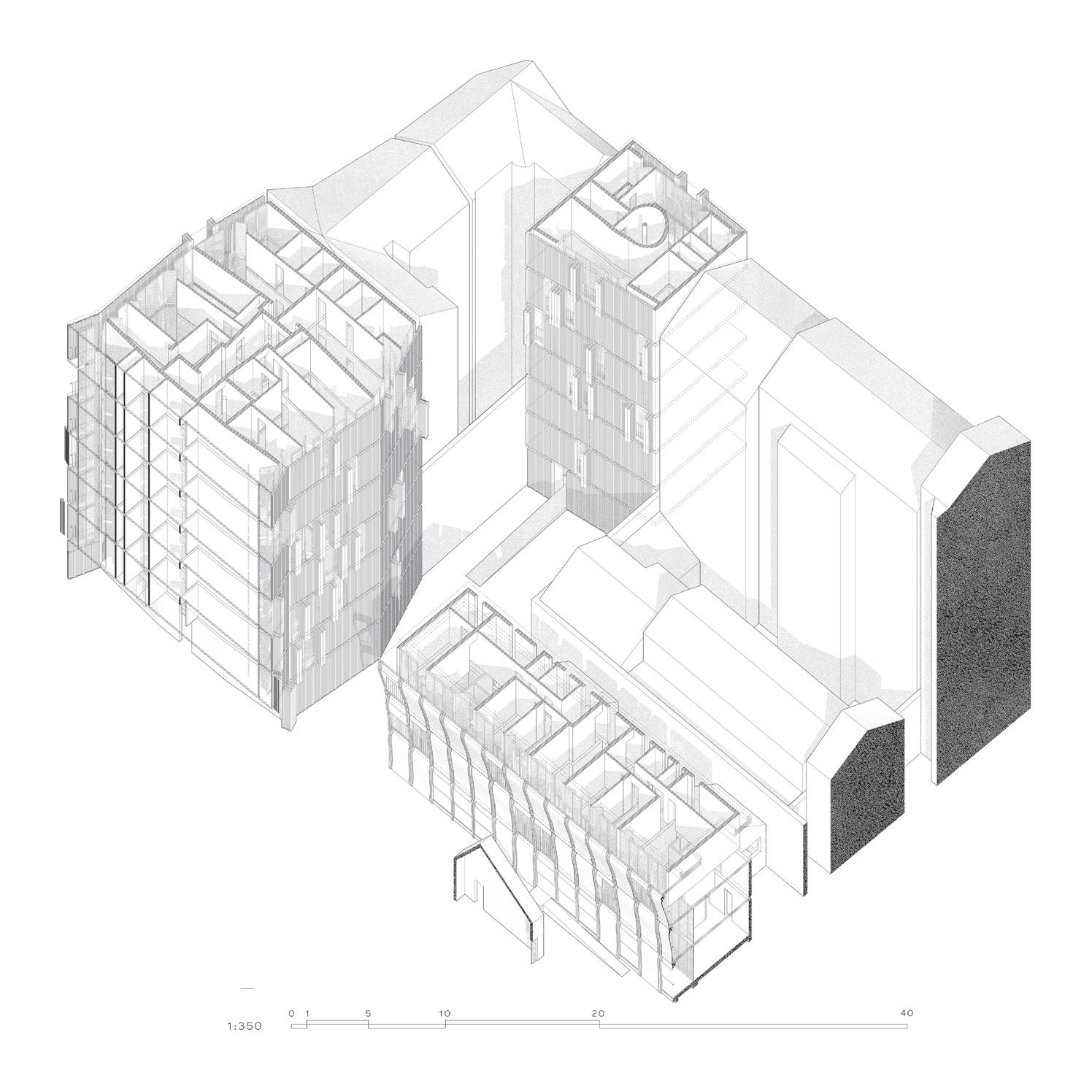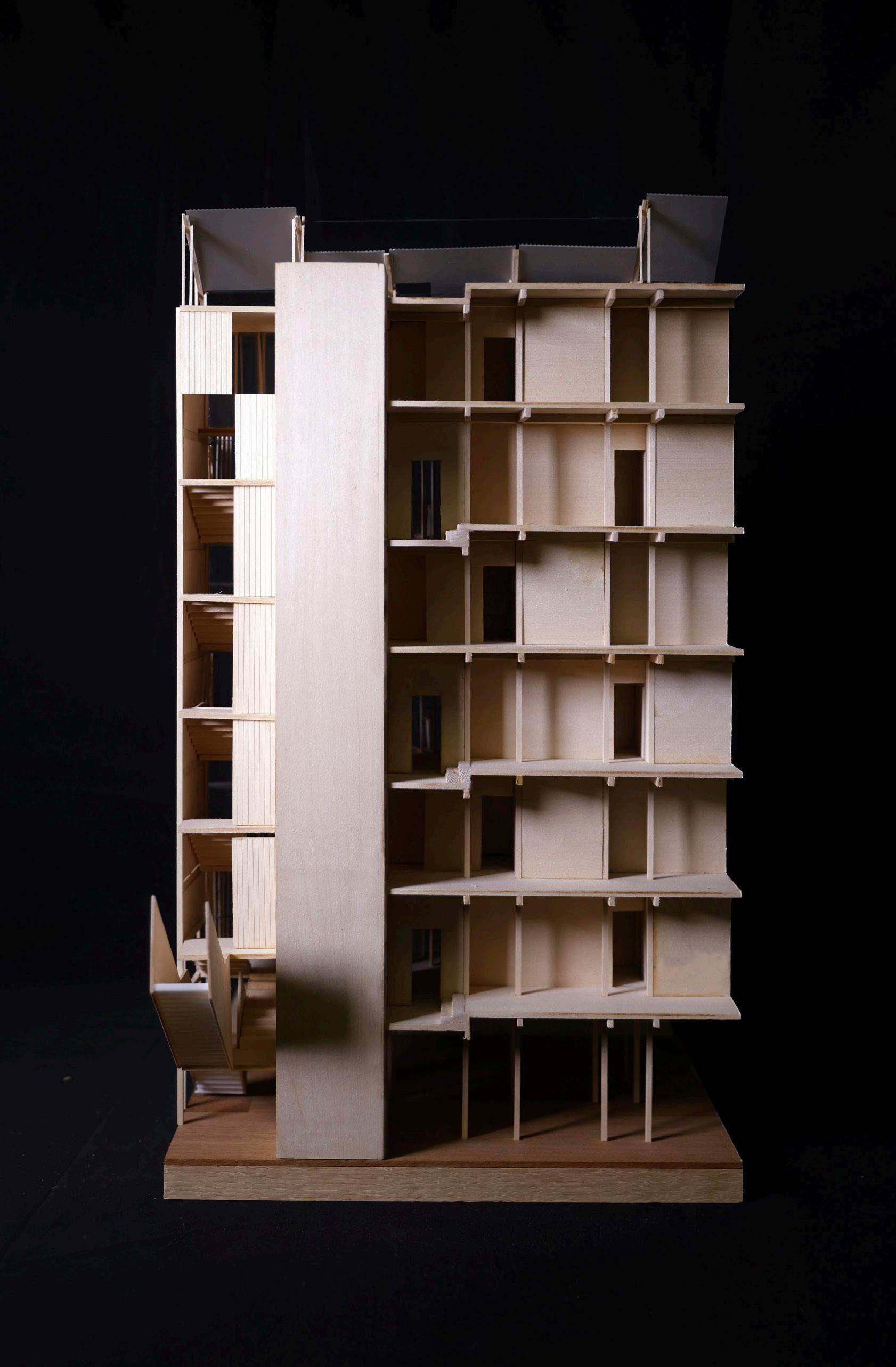 The rental single units are positioned on the northern side of the plot, facing Rivington St. They boast vertically interlocked, double-height living rooms, appealing to young renters in search of a novel residential experience.