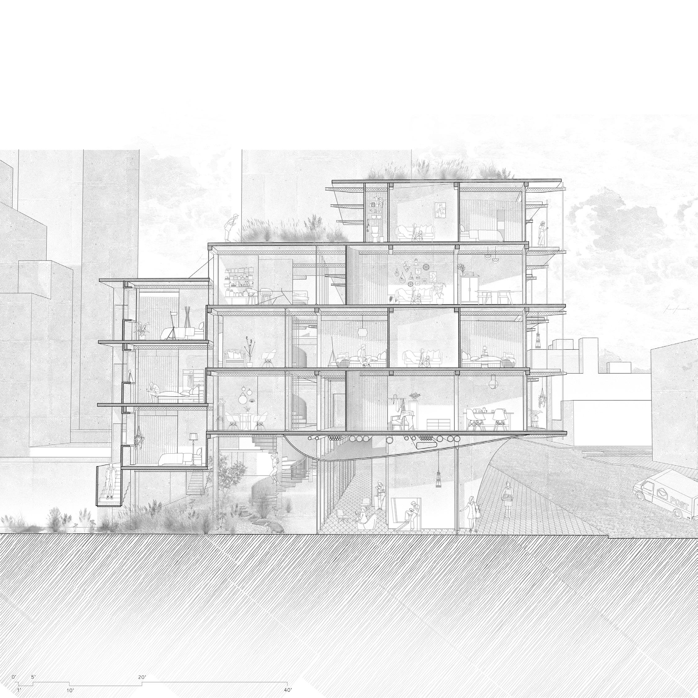 The design carefully scales the building to harmonize with its surrounding context. It comprises a mix of modular unit types— including studios, two-story one-bedroom units, and three-story two-bedroom units—for a total of ten residences. This variety supports diverse living needs while maintaining a coherent architectural volume. At ground level, the program expands to include a community library and café These amenities activate the street edge, fostering social interaction and providing shared resources that integrate the building into the daily life of the neighborhood.