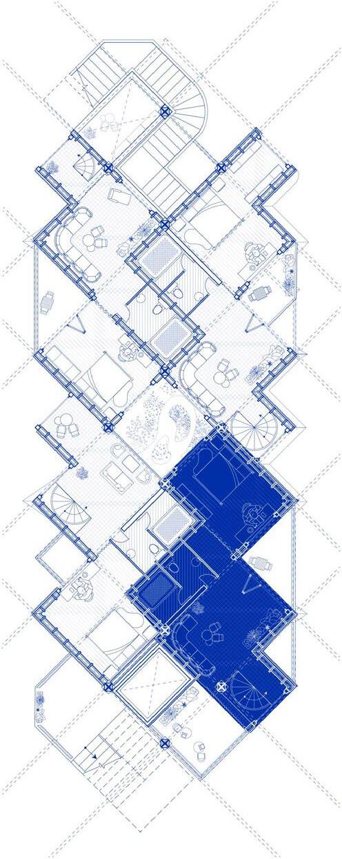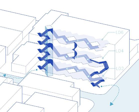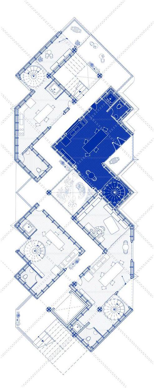 The defining communal spine is a zigzagging corridor that weaves vertically around skylights on alternating floors, drawing daylight deep into the plan and creating a rhythm of illuminated spaces. With two access points per level, this path enhances orientation and accessibility. Its dynamic geometry naturally slows movement, forming informal gathering pockets that foster unplanned encounters. Functioning as a social condenser, it acts as a vertical street that encourages connection and dialogue among residents.