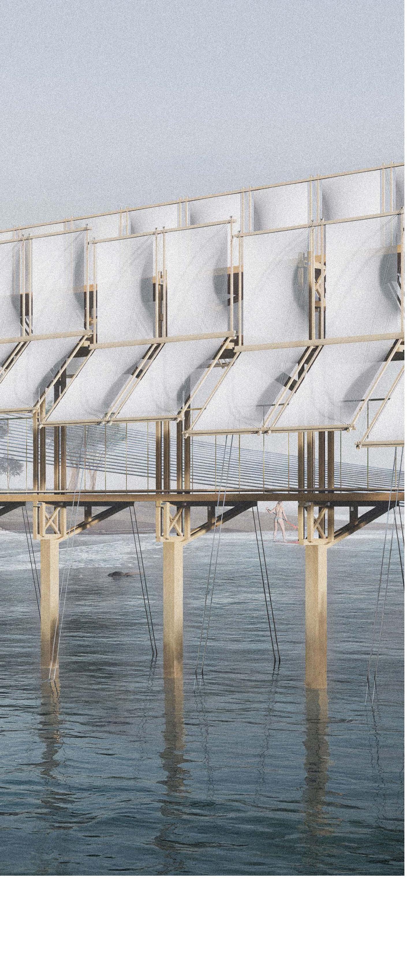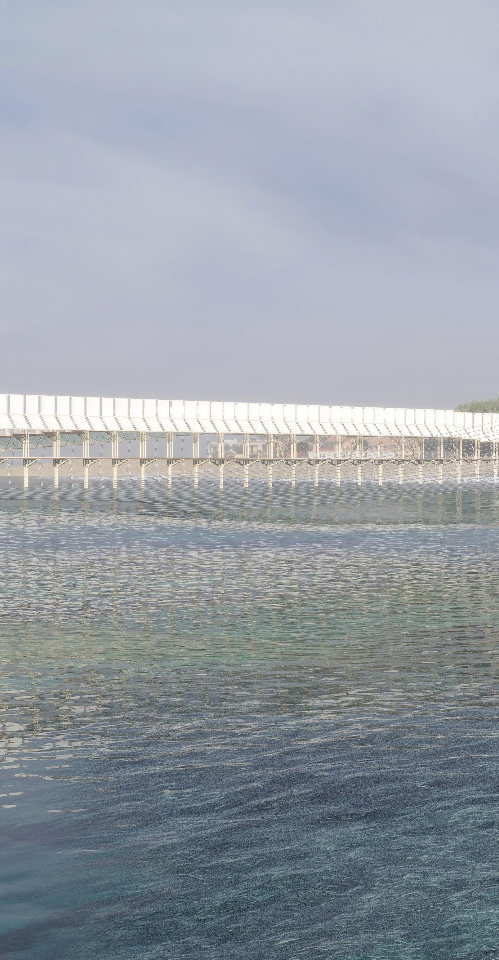 The floating bridge is reimagined as a linear causeway that extends into the ocean, linking several programmatic zones within the masterplan. Its elongated form creates a continuous promenade that culminates in a far terminal, housing a sightseeing platform and a slide descending into a mobile swimming pool suspended from the "Tuxedo" system. This structure transforms walking into a deliberate, almost spiritual journey: a passage where movement feels both inevitable and measured, shaped by the rhythmic expanse of the sea and sky. In this setting, the act of traversal becomes an exercise in perception, framing views and sequencing encounters in a narrative of approach and arrival.