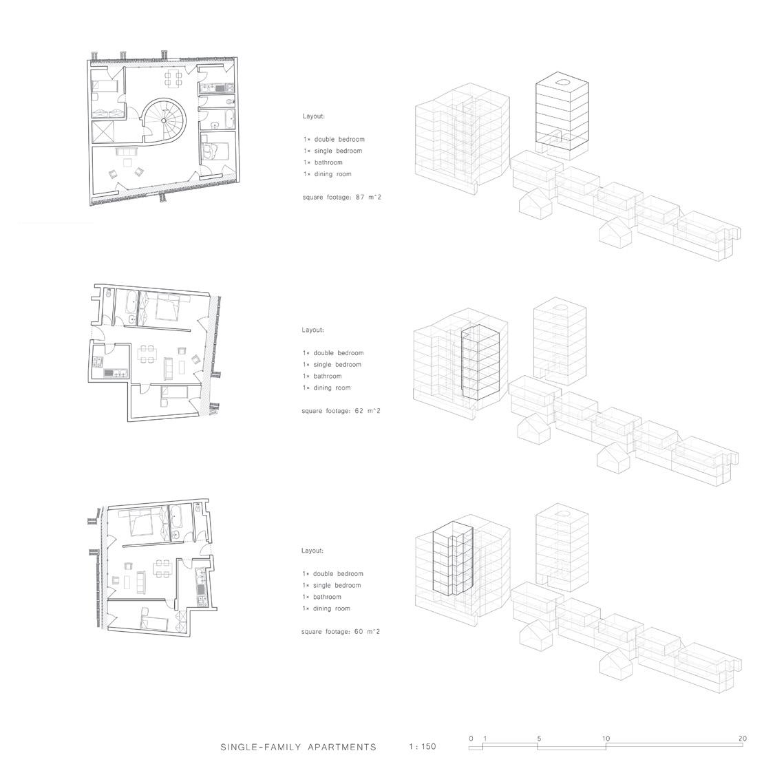 The project promotes social and demographic inclusivity through a varied composition of residential units, encompassing spacious three-bedroom family apartments alongside more compact one-bedroom configurations. This range accommodates diverse household sizes, needs, and lifestyles, ensuring broader accessibility within the urban fabric.