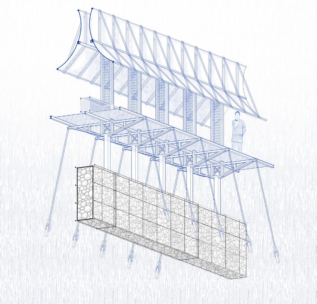 We envision a specific, resonant sequence of demise. The tensile "Tuxedo" canopy is projected to reach its structural limit during an extreme tidal surge or flood event, eventually shearing away. What remains is its stark, skeletal frame: a grandiose, tacit billboard standing as a monumental relic that silently narrates the site's climatic history and former use. This process of subtraction reveals a new form and a new meaning.