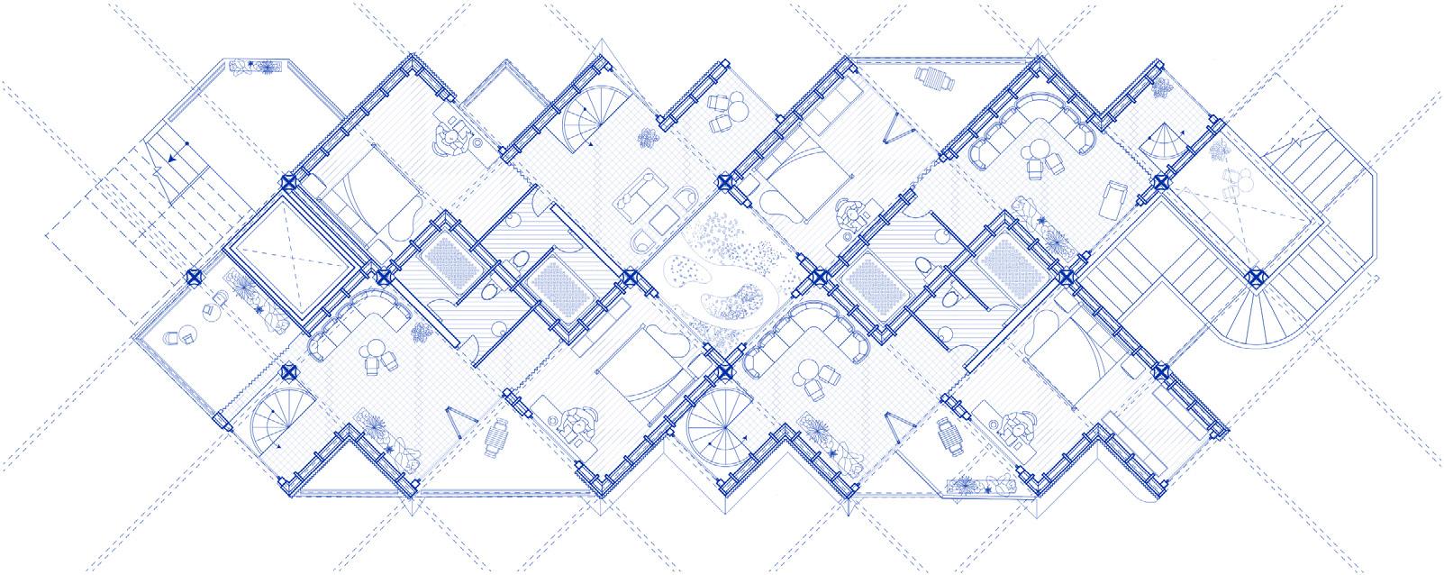 The three backside courtyards are divided by stacks of split-level co-op apartments, featuring shared living rooms and two queen-size bedrooms connected by staircases. *For a more in-depth view of these units, refer to the project's introduction page, where a detailed illustration is provided.