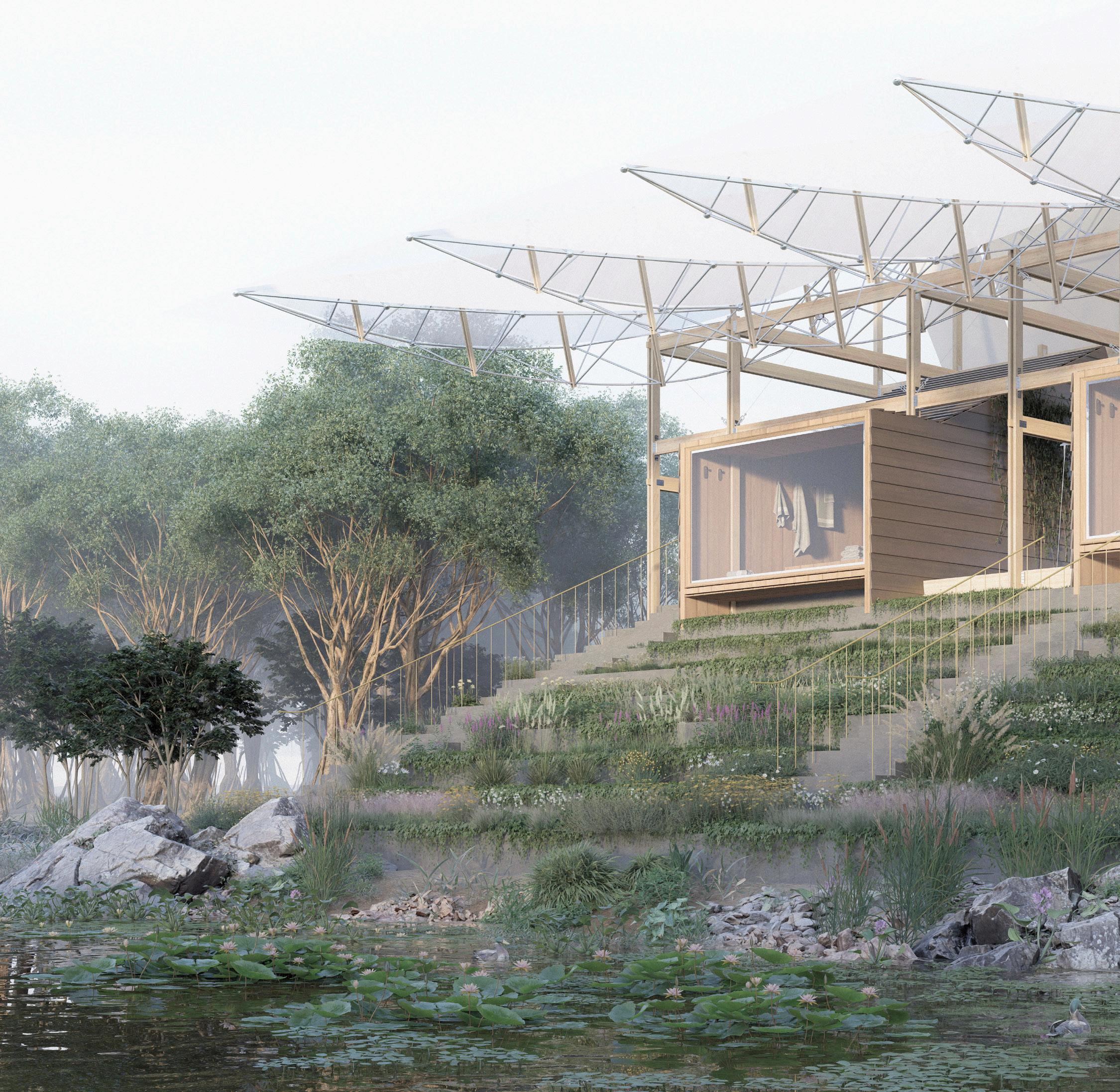 The bleachers are no longer objects for spectacle but are enveloped with native vegetation, dissolving their hard edges back into the landscape. Within this re-greened landform, we have inserted four submerged sauna rooms, using the existing staircases for access to create intimate, sensory experiences focused on the natural environment.
