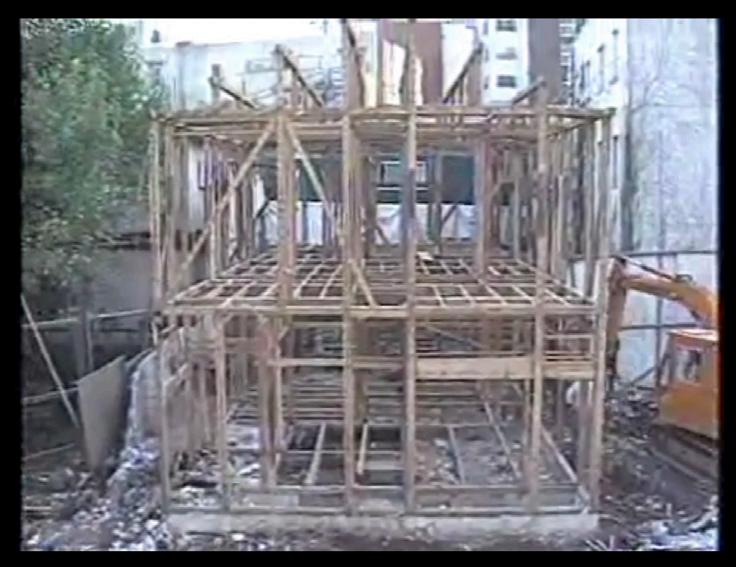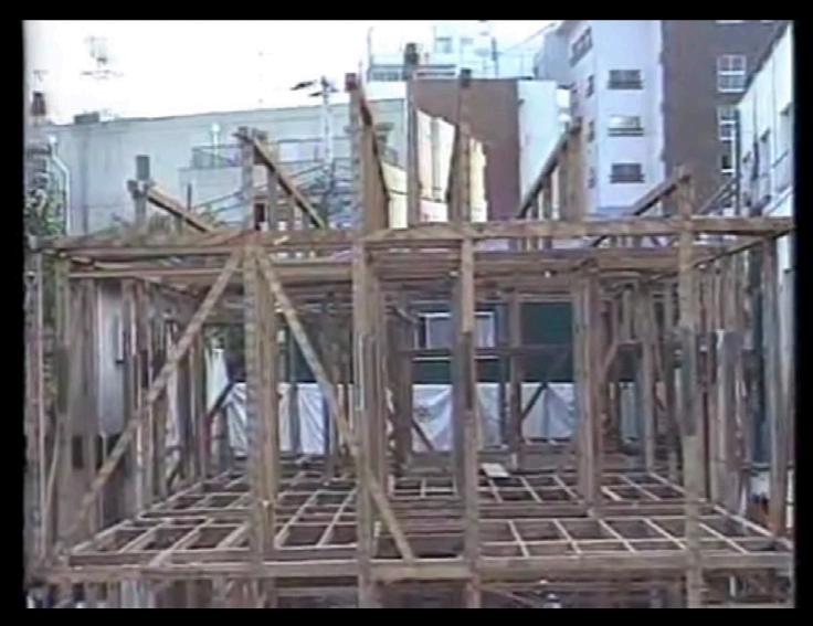 To give an overview, in 1987, a wooden house was demolished and a new building was constructed on the site, a common scheme in the modern era. Ryoji Suzuki decided to call a halt to this plan, and instead of destroying the house, he demolished it, leaving only the wooden axis intact, in an attempt to rewind the act of construction. He then placed metal wires for the purpose of a short-term earthquake-resistant structure, and inserted glass panels of six-thirds glass on the first floor only, using T-shaped steel bundles in key places throughout. Afterwards, the glass floor was broken with a hammer in front of a crowd of people who were attracted to the architecture without knowing the specific intent of the project, and this was captured on video. This goes beyond the meaning of the architecture and leads us to various speculations.