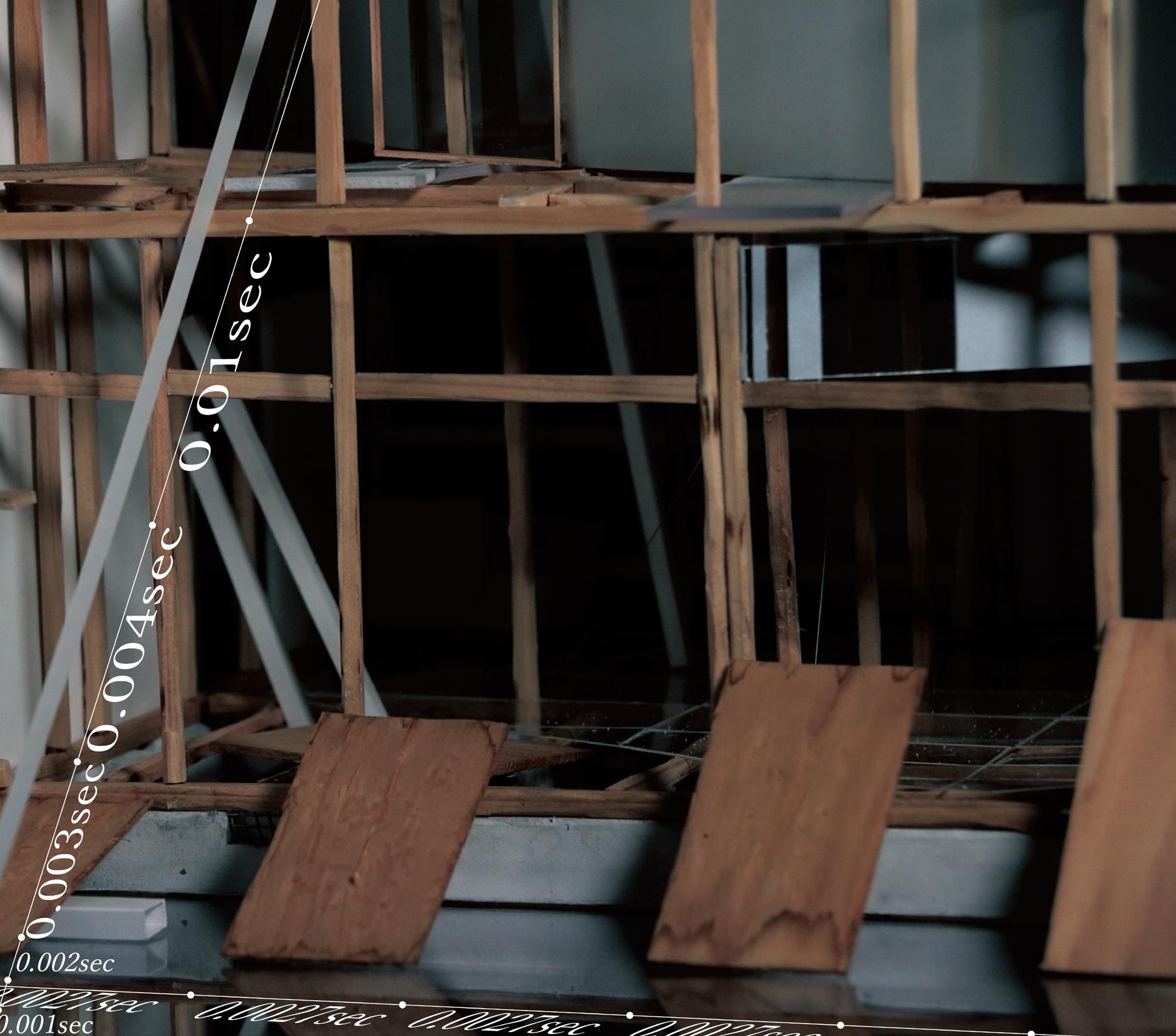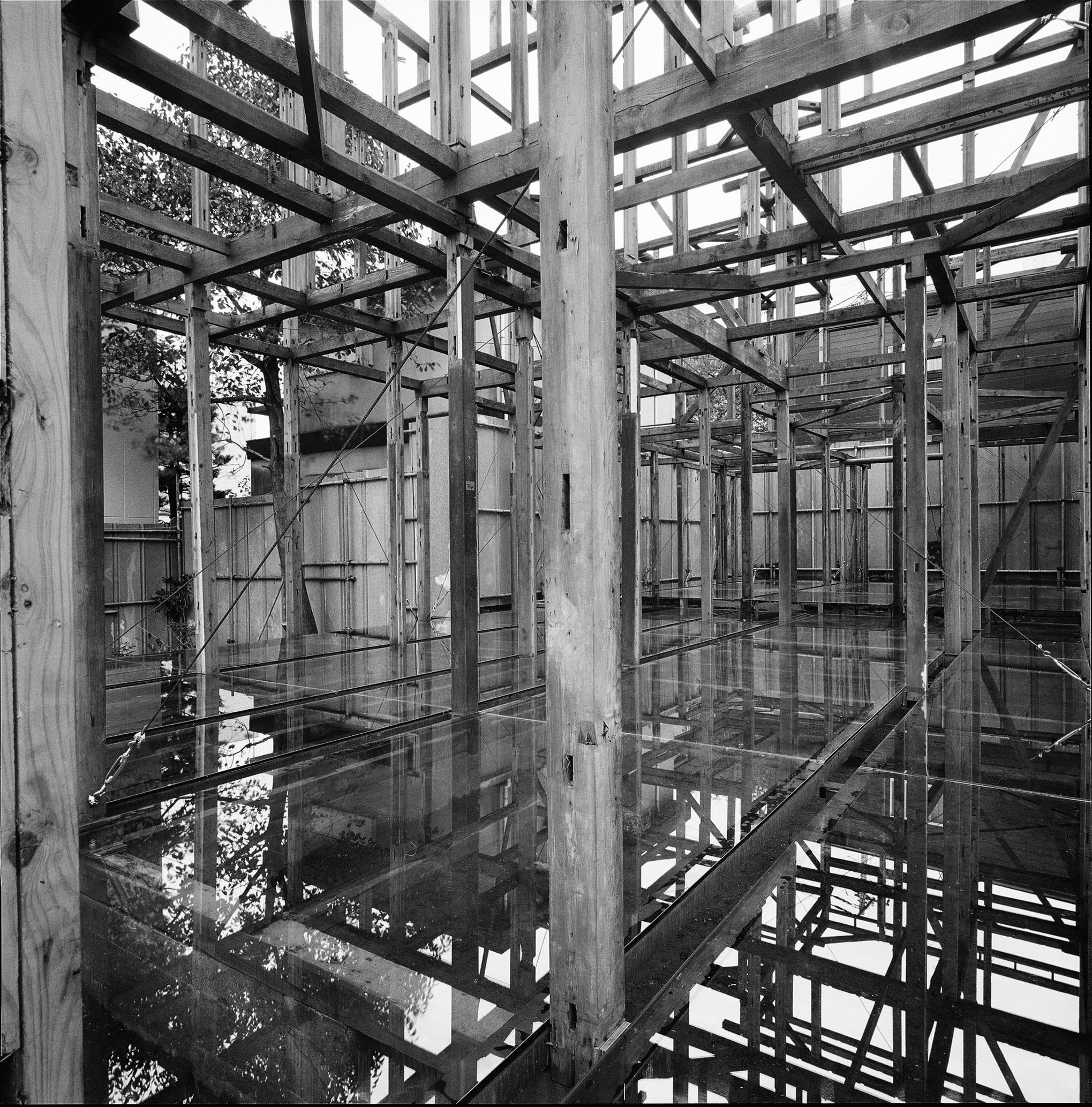 To give an overview, in 1987, a wooden house was demolished and a new building was constructed on the site, a common scheme in the modern era. Ryoji Suzuki decided to call a halt to this plan, and instead of destroying the house, he demolished it, leaving only the wooden axis intact, in an attempt to rewind the act of construction. He then placed metal wires for the purpose of a short-term earthquakeresistant structure, and inserted glass panels of six-thirds glass on the first floor only, using T-shaped steel bundles in key places throughout. Afterwards, the glass floor was broken with a hammer in front of a crowd of people who were attracted to the architecture without knowing the specific intent of the project, and this was captured on video. This goes beyond the meaning of the architecture and leads us to various speculations.