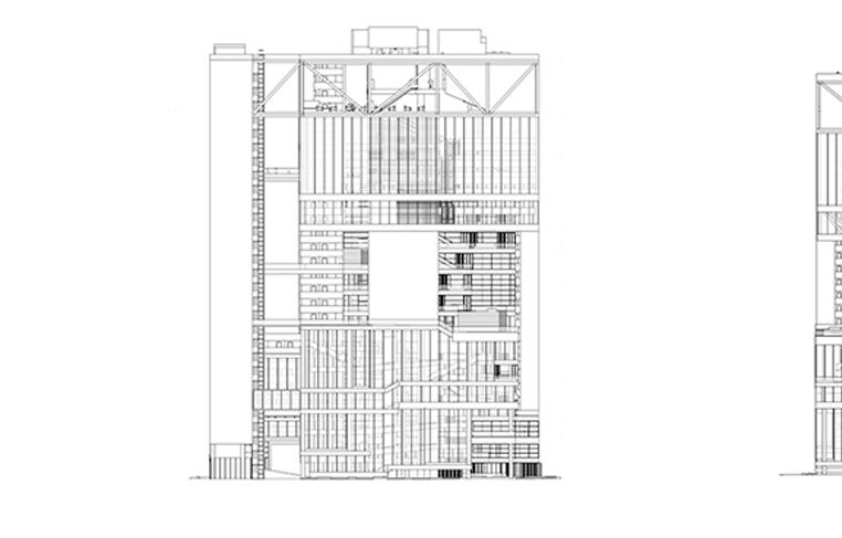 This architecture is consisted of total of 10 stories. The programs are theater, exhibition hall, cafe, bar, bookstore, outdoor gathering, music rooms, rehersal rooms, library, auditorium, and administration offices. The school has the hierarchy system of organization where it goes from more public to more private from bottom to top. For instance, public theater is located in the celler whereas the administration is located on the top floor. The circulation of the building starts from the spiral ramp located on the corner of the architecture. The ramp is also divided at the 4th floor which is where the private part of the programs starts.