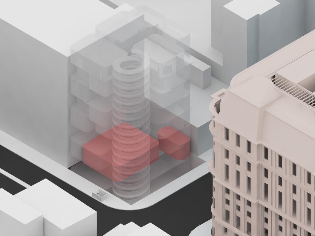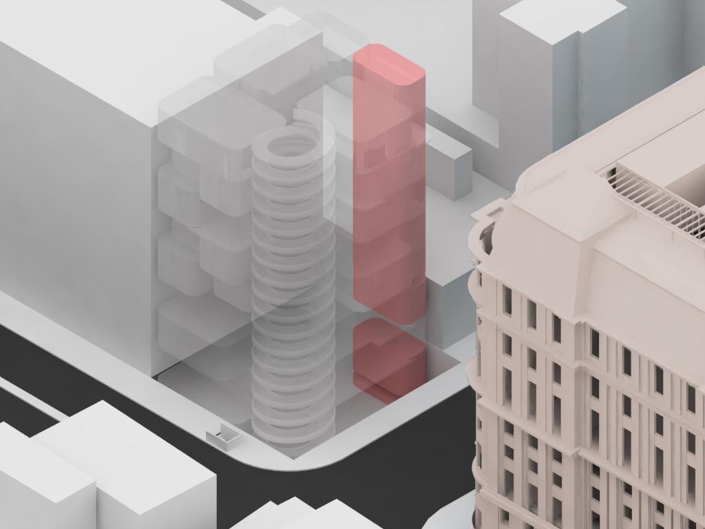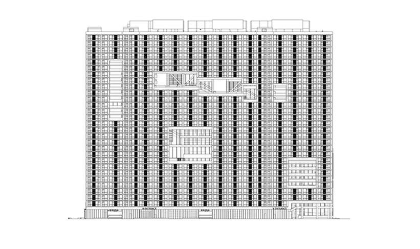 Instead of applying the back on the ground floor, the setback is located on the 7th floor to open up the outdoor space for the students in order to engage with the view of the city and the school. The important factor to consider was the corner condition of the building where the outdoor balconies are designed for the visual connection with the school.