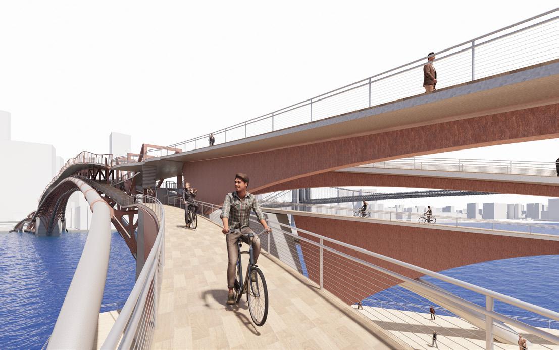 The top deck of the bridge is for the pedestrians. On the brooklyn side, the pedestrian path starts from the Brooklyn Bridge Park. By extending the part to the starting point of the bridge brings people towards the paths. The circulation of the pedestrians does not stop and continues all the way to the Pier 15 on the Manhattan side.