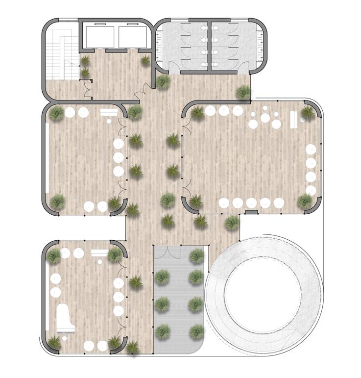 The architecture can be divided into 3 parts : the public, the interaction space, and the private. The public theater is located in the celler for everyone who purchases the ticket from the ticketing on the ground floor. The main hall and exhibition space is also located on the ground floor for public. Also, for the public, the cafe, bar, and bookstore are located on the second floor. On the third floor, there is the outdoor gathering space where the public and the students can interact with each other. From the fourth floor, there are music rooms, rehersal rooms, library, auditorium, and administration for the students of the dance academy.