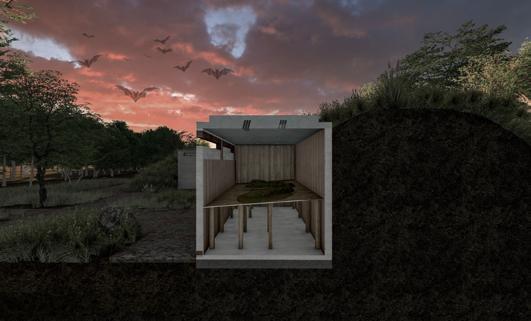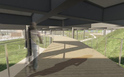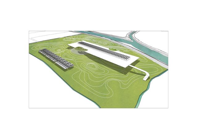 The building portion is renovated and becomes a facility for environmental monitoring of the Nara Basin, serving as a climate observatory for the Nara Institute of Science and Technology. Rooms are inserted through the large slab, creating a botanical garden, library, offices, restaurant, plant factory, and bookstore, with an herb and medicinal plant garden on the rooftop.