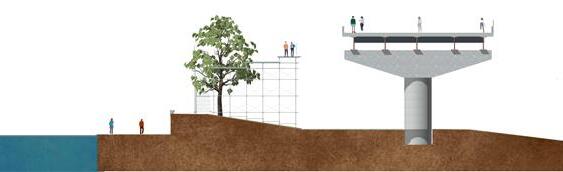The design incorporates terraced decks at strategic locations to create vertical connections between ground level and the expressway. These connections would effectively transform the highway into a grand urban deck for festival celebrations.