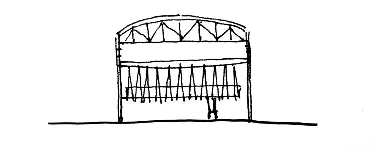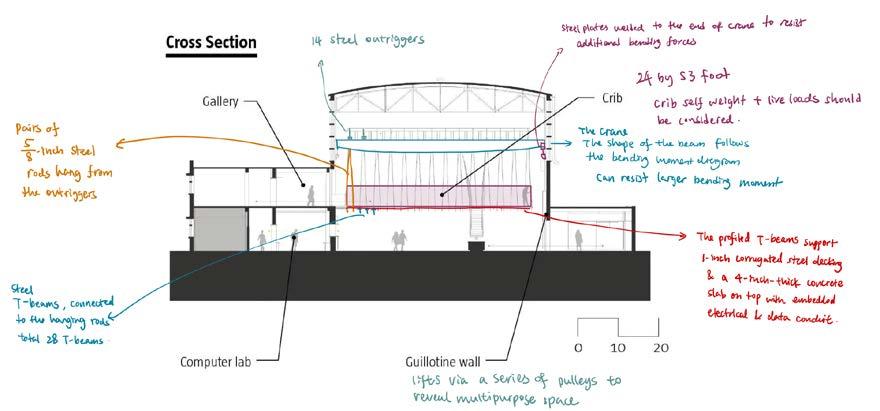 The intervention introduces a suspended “hanging crib” system attached to the building’s existing gantry crane. By combining a subtle tension-rod system with an open studio space below, the design preserves the expansive, high-bay character of the original structure. The hanging elements—particularly the mezzanine—liberate the ground floor from new columns, allowing it to function as a flexible design studio while giving the mezzanine a distinct floating quality.