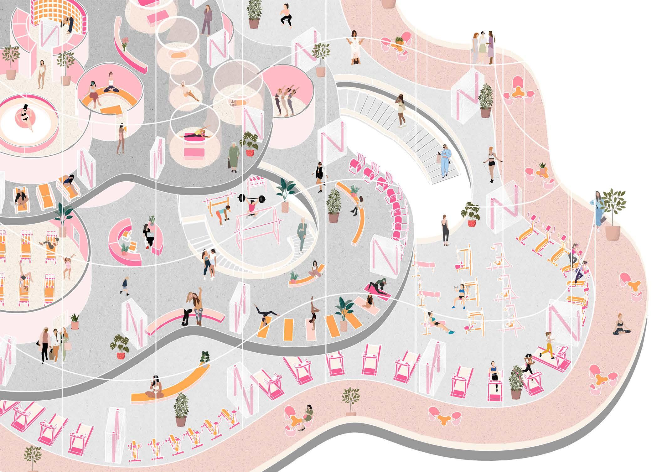 This project stands out from traditional fitness centers not only for being exclusive to women but also for its unique functional aspects. It incorporates a substantial amount of social space that complements the fundamental fitness features. For women, the significance of fitness extends beyond the physical aspects, encompassing relaxation and joy derived from communication and social interaction during the fitness process.