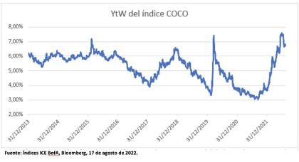 Por su parte, TrentyFour AM, gestora de Vontobel especializada en Renta Fija comenta que «pocas veces hemos visto tan atractivo el sector de los AT1«. A finales de julio, los analistas de Citi señalaron que el índice COCO se había ampliado en 350 puntos básicos en lo que va de año (hasta el 25/7/22), los diferenciales de los AT1 eran ahora más amplios que a finales de 2018 (cuando las tensiones comerciales y el endurecimiento de los bancos centrales asustaban a los inversores) y se encontraban en niveles similares a los observados durante una minicrisis del mercado a principios de 2016, cuando la preocupación por la capacidad de Deutsche Bank para pagar sus cupones de AT1 provocó una venta aún mayor. De hecho, la única vez que el sector ha parecido más atractivo sobre la base de los diferenciales a escala del índice fue durante un periodo muy breve en 2020, en el punto álgido de la crisis de la COVID-19.