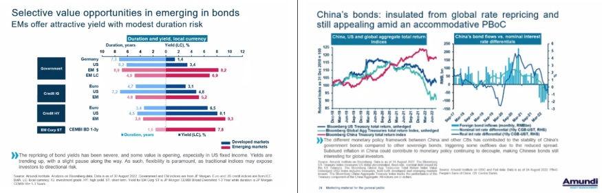 largos. Sin embargo, puntualiza que el mercado de crédito corporativo (tanto el grado de inversión como el de alto rendimiento) no están descontando una recesión. De hecho, los diferenciales de alto rendimiento estan por debajo del promedio (450 pb) mientras que el grado de inversión estan por debajo de 150 pb, por debajo de como estaban al principio del verano. El equipo de Amundi comenta que hay oportunidades también en emergentes, siendo muy selectivos, pero las rentabilidades que ofrecen son atractivas aunque con algo de riesgo de duración. Respecto a la divisa, que es un punto importante en emergentes, considerar que existe poco upside para dichas divisas debido a que considerar que el rally en el dólare podría continuar en el corto plazo. Hacen mensión a los bonos chinos, y los consideran ailsados de la revalorización global de los tipos a pesar de la política acomoditicia del Banco Popular de China.