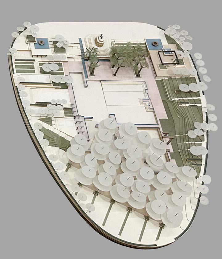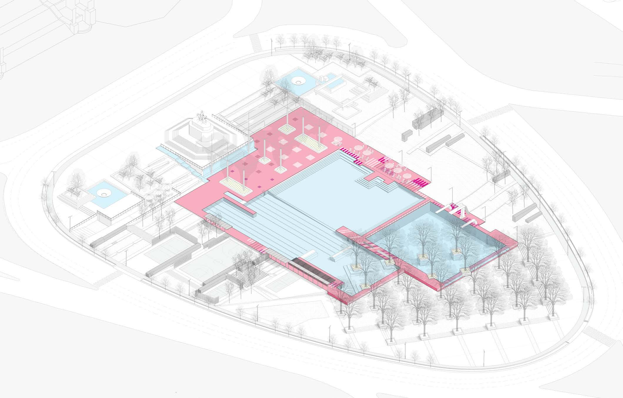 Pool is not just a water pond, things happen around it. Zoom into the most important area, the deck, it create a loop that programmed with activities. The activities around the deck change according to the zone: the centered swimming pool, the monumental plaza, the lawn, the sport garden, and the grove.