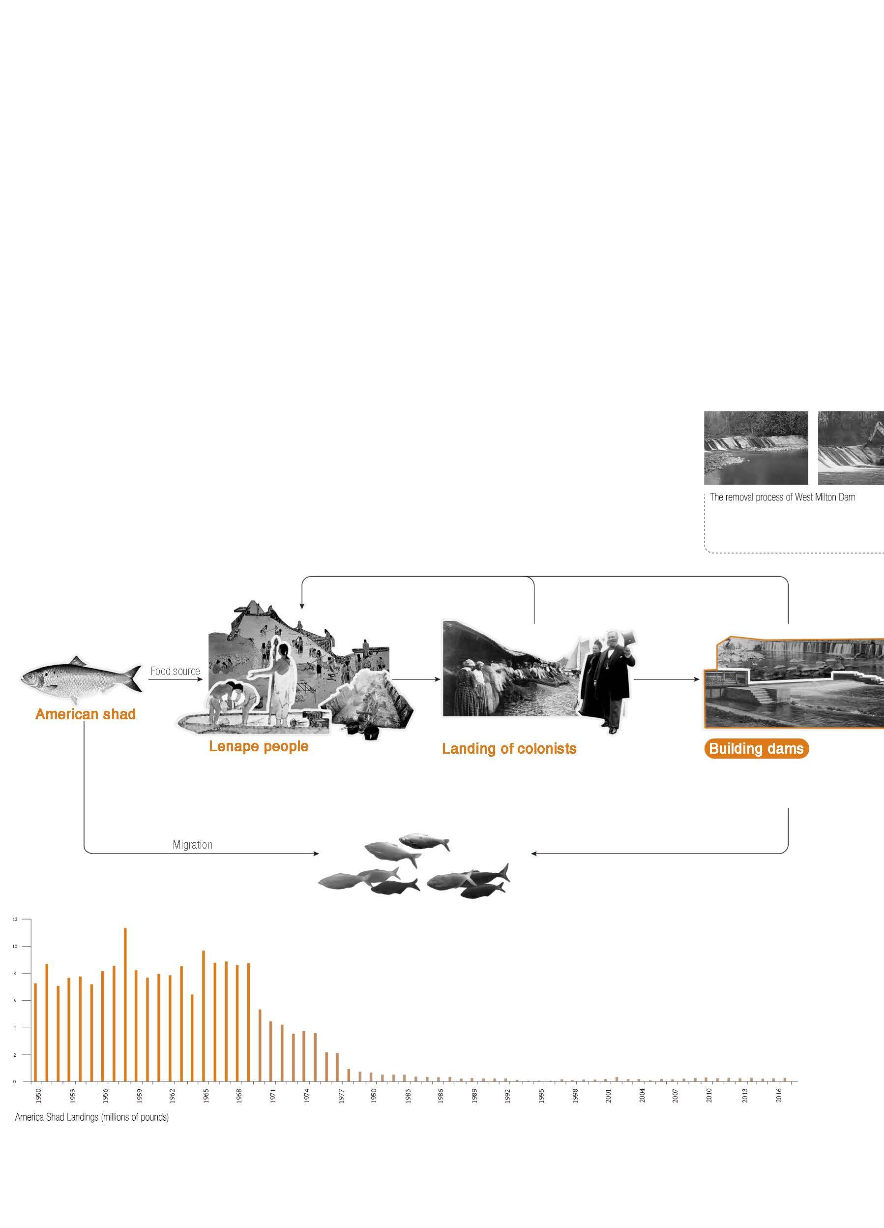 The development of the dam can be divided into three phases. The first phase, was the period when the colonists first entered the area, as the setting of the dam affected American shad, Lenape’s food source. This eventually led to Lenape leaving the land. The second phase was the period when the region was building mills that supported mainly cotton manufacturing but also paper, flour, gunpowder, leather and machinery manufacturing. The mouth of the Brandywine River near the end of the fall line allowed ships to sail directly to the mills. At this stage, the river’s water power was used extensively. By the third stage, the use of hydroelectric power in the area was gradually eliminated and some organi zations began to advocate the removal of useless dams.