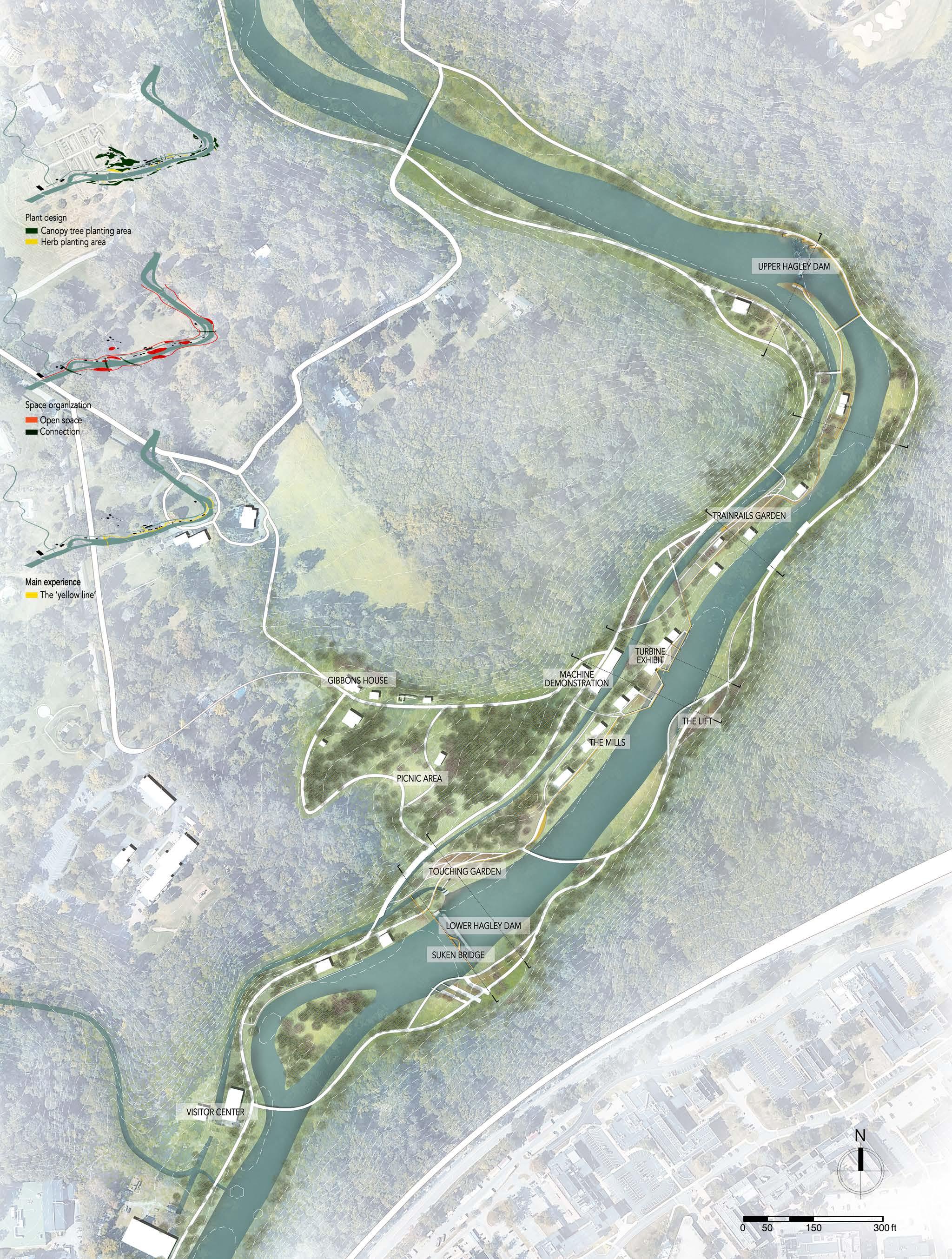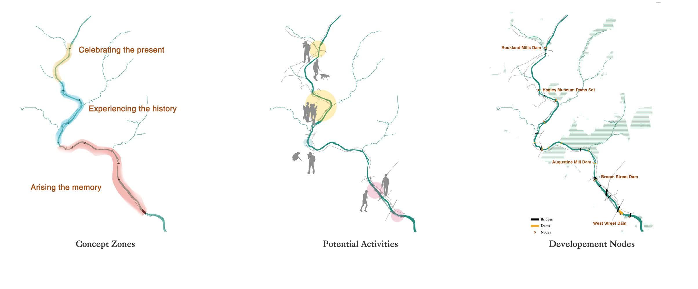 Zooming in the Brandywine Greenway region, several dams were demolished due to the Shad 2020 in Wilmington.Some retained for its historical values and some of them their fate are waiting to be decided. A trail system is consider to be designed to link these dams using different methods.