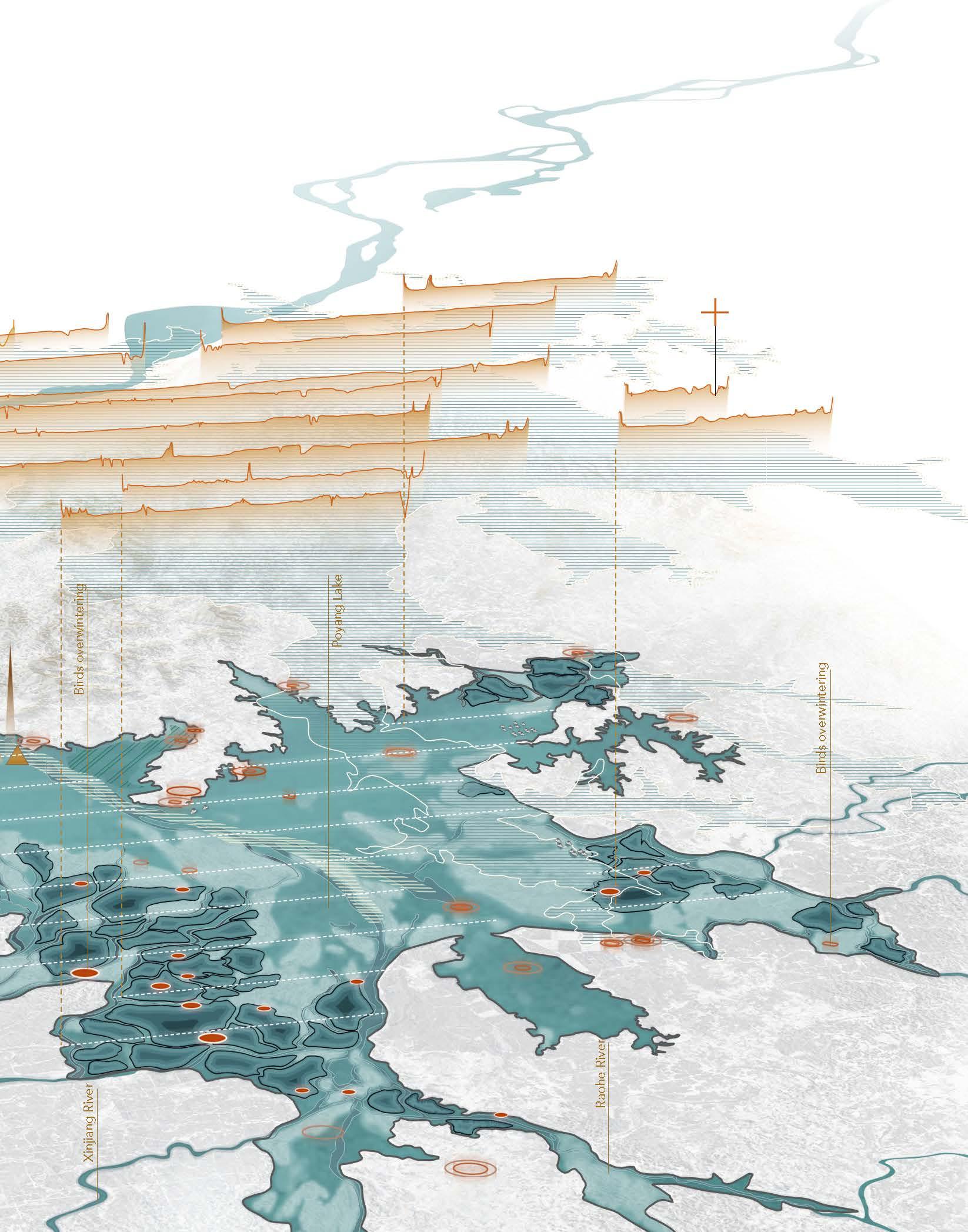 The site is divided into three underwater layers and one shore layer. In dry season, the dish lake will store water and serve as a fishing site in autumn and winter. The first layer on the shore allows tourists to land. During the later stages of construction, reeds and other water purifying plants are planted on sand blocking islands and ecological islands.