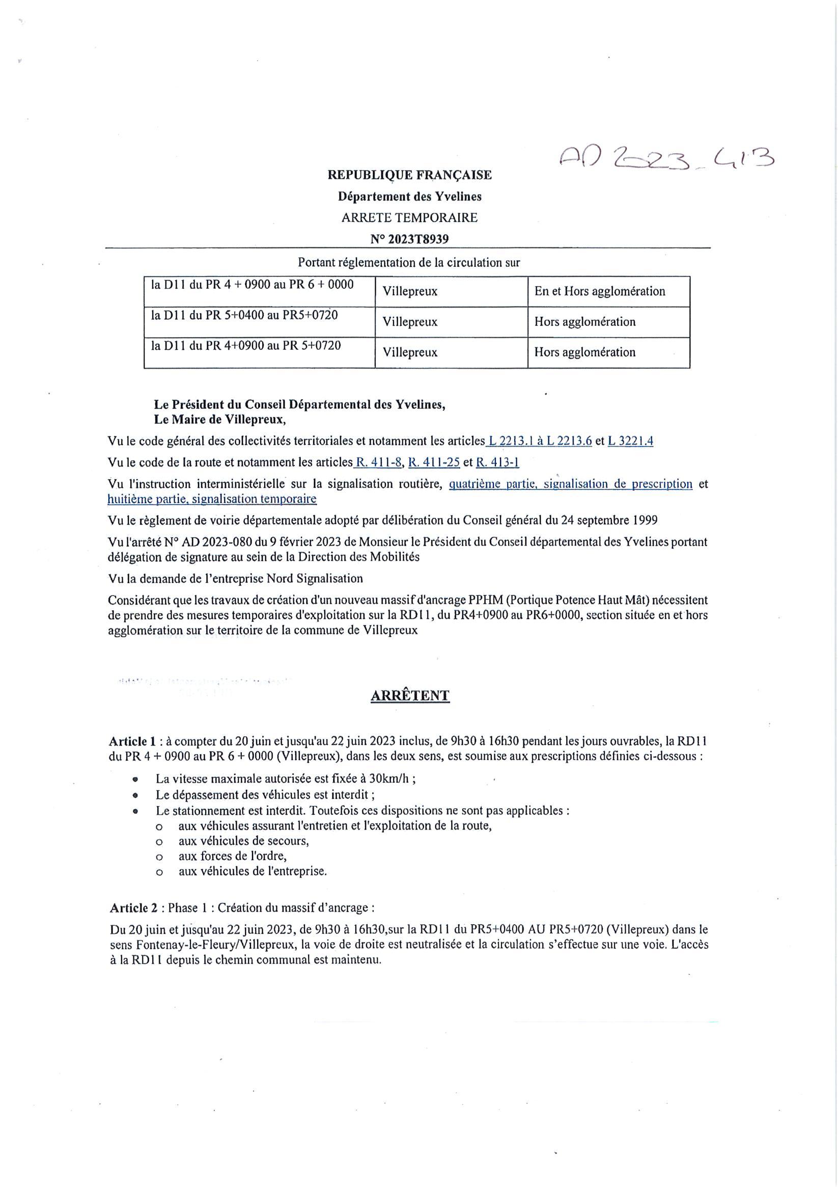numéro d’arrêté et date de signature Intitulé de l’arrêté Pages AD 2023-409 du 12 juin 2023 Arrêté temporaire portant réglementation de la circulation sur la D57 du PR 2+0490 au PR 2+0880 Vélizy Villacoublay hors agglomération, En agglomération (emprise trottoirs) Vélizy Villacoublay. La D57 du PR 2+0490 au PR 2+0880 Vélizy Villacoublay hors agglomération, en agglomération (emprises trottoirs) Vélizy Villacoublay. 2 AD 2023-410 du 12 juin 2023 Réglementation temporaire du stationnement et de la circulation sur toutes les RD 152 et 937 hors agglomération sur le territoire de la commune de Rambouillet. 4 AD 2023-411 du 2 juin 2023 Arrêté temporaire. Réglementation de la circulation sur la RD10 du PR 7+0370 au PR 7+0970 Versailles hors agglomération. 6 AD 2023-412 du 2 juin 2023 Arrêté temporaire. Réglementation de la circulation sur la D119 du PR 4+381 au PR 4+767 Thoiry hors agglomération. 9 AD 2023-413 du 2 juin 2023 Arrêté temporaire. Réglementation de la circulation sur la D11 du PR 4+0900 au PR 6+0000 Villepreux en et hors agglomération, la D11 du PR 5+0400 au PR 5+0720 Villepreux hors agglomération et la D11 du PR 4+0900 au PR 5+0720 Villepreux hors agglomération. 11 AD 2023-414 du 2 juin 2023 Arrêté temporaire. Réglementation de la circulation sur la RD912 du PR 4+0500 au PR 4+0850 Plaisir hors agglomération. 13 AD 2023-415 du 12 juin 2023 Arrêté temporaire. Réglementation de la circulation sur la RD 307 B2 du PR 0+0000 au PR 0+0134 Bailly en et hors agglomération, la RD 307 B3 du PR 0+0000 au PR 0+0010 Bailly en agglomération, la RD7 du PR 4+0529 au PR 4+0566 Bailly en agglomération 15 AD 2023-418 du 13 juin 2023 Arrêté temporaire. Réglementation de la circulation sur la D 912 du PR 12+547 au PR 14+326 Méré, Neauphle le Vieux hors agglomération. 17 AD 2023-419 du 14 juin 2023 Arrêté temporaire. Réglementation de la circulation et du stationnement sur la RD80 à Gazeran hors aggloméraiton. 19