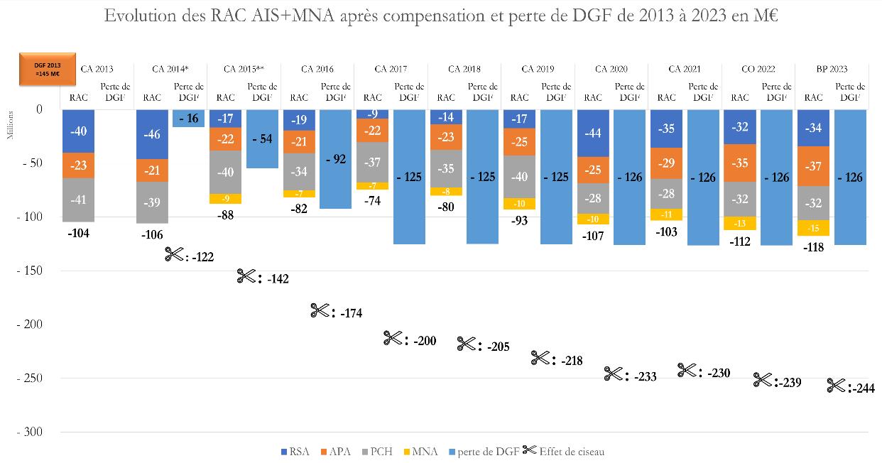 Les compensations des transferts des allocations individuelles de solidarité 30 (AIS) ainsi que des produits de gestion courante devraient connaître une légère hausse par rapport à 2022 mais toujours insuffisante au regard de l’accroissement des dépenses correspondantes, augmentant d’autant plus le reste à charge sur les AIS pour le Département ;