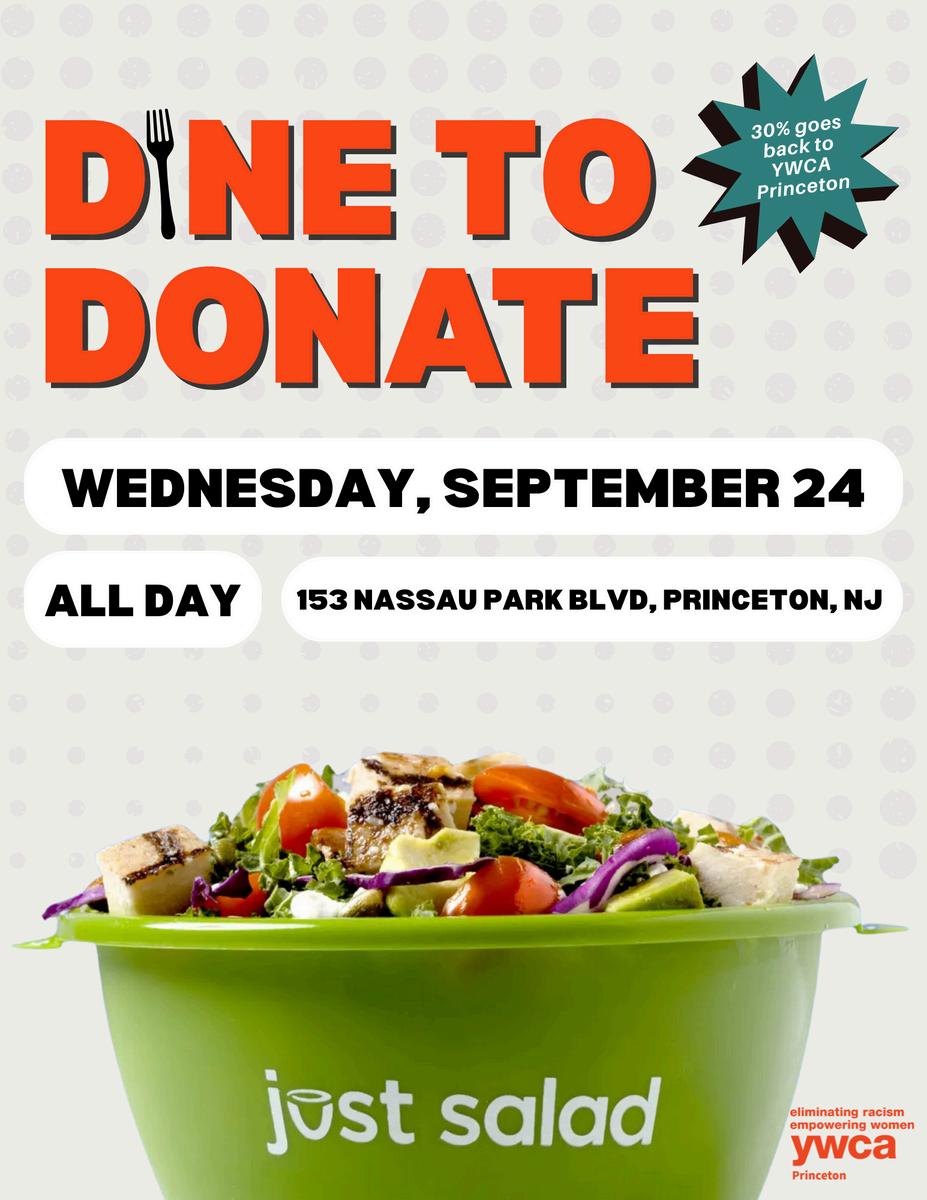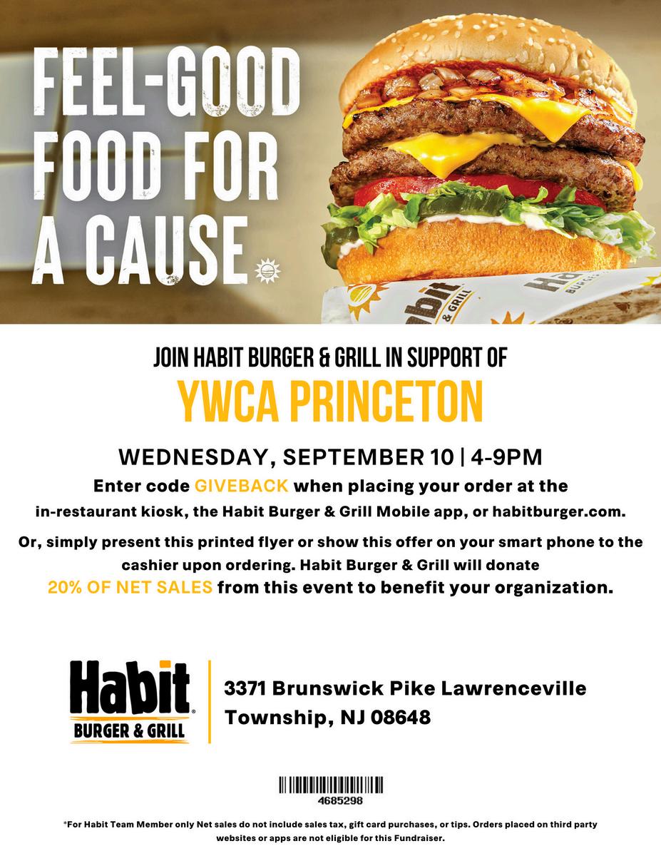 Ourfirsteventwillbeheldat HabitBurgeronWednesday, September10from4–9PM, where20%ofyourpurchase willbedonatedtoYWCA Princeton.Thesecondevent willtakeplaceatJustSalad onWednesday,September 24allday,where30%ofyour purchasewillbedonatedto YWCAPrinceton.Markyour calendarsanddinewith purpose!