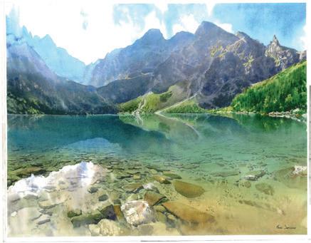 stawów, w których szmaragdowych toniach odbijają się szczyty wier chów, cienie rzucane przez pnie obsypanych śniegiem smreków oddają, pokazują góry piękne, jakby intymne i dziewicze, nieskażone działaniami człowieka. Z rzadka po jawiają się niewielkie szałasy okryte czapami śniegu, puste i martwe zimową porą. Precyzyjne akwarele Suffczyńskiego wywołują wrażenie lekkości, ciszy i spokoju. Są oazą dla współczesnego człowieka na beto nowej pustyni, w której stopniowo przychodzi nam żyć. Paradoksalnie to dzieła sztuki zmuszają do po szukania w górach, a może również w sobie tej ciszy i spokoju. Wrażenie synestezji jest zasługą maestri artysty, jego widzenia świata, ale również znajomości topografii gór, bez której oddanie wrażenia obco wania tylko z górami i ich Stwórcą byłoby niemożliwe. Pejzaże zimowe wymagają szczególnej uwagi. Biel śniegu okrywającego szczyty gór, leśne polany, drzewa, okręglice w potokach, w zestawieniu z błę kitem nieba powinny jako barwy zimne wywoływać takie też odczu cie. Pod pędzlem mistrza dzieje się jednak odwrotnie. Obrazy wywołują odczucie ciepła i przytulności. (Od wrotnie niż na zimowych akwarelach Juliana Fałata) Zachęcają do przy bycia w Tatry i eksplorowania ich niczym pierwsi badacze. To swoisty Dziennik podróży do Tatrów Michała Suffczyńskiego.
