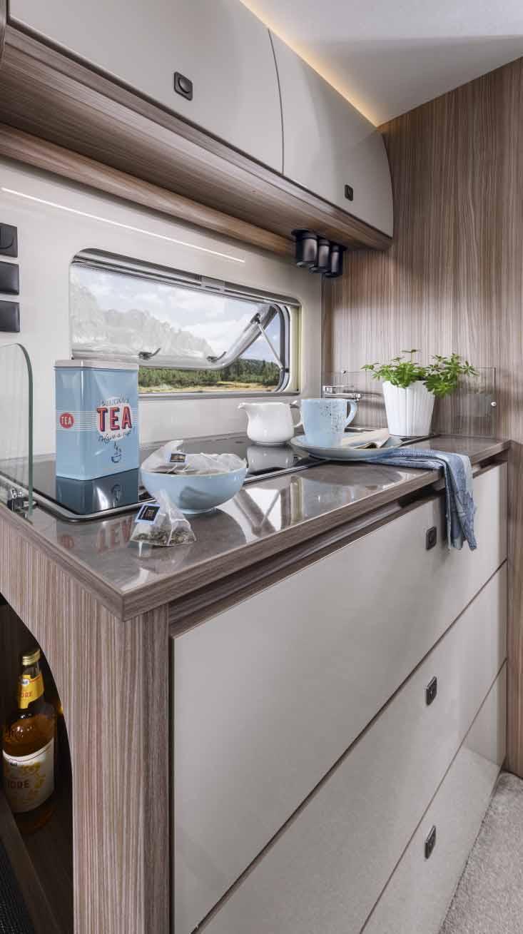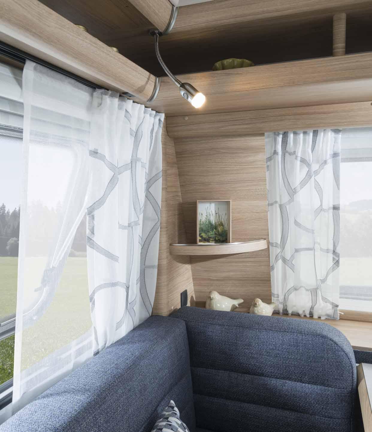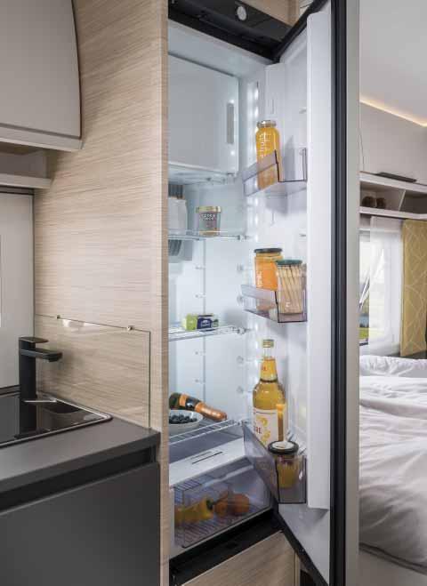 • Entrance door with integrated and insulated access, waste collector, tinted window and blackout pleated blind in the upper area of the entrance door, new look in the Diamant. Bianco Activ 390 FHS shelf instead of waste collector