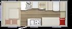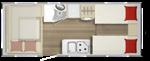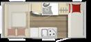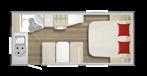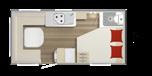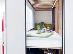 Quer über der Sitzgruppe eingebaut, schafft das Hubbett Raum und Kompaktheit zugleich. Im Vergleich sind die „Plus“-Modelle, bei 7 Schlafplätzen, rund 2 m kürzer als andere Wohnwagen. Das verbessert das Handling beim Fahren und spart rund 400 kg Gewicht.