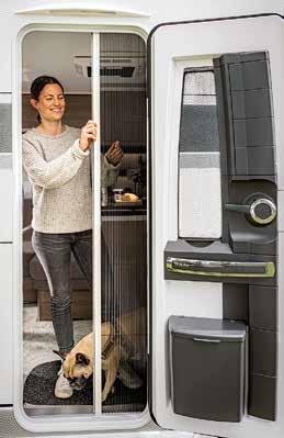 One-piece entrance door, extra wide with triple-point locking, window, waste bin, compartments and pleated fly screen