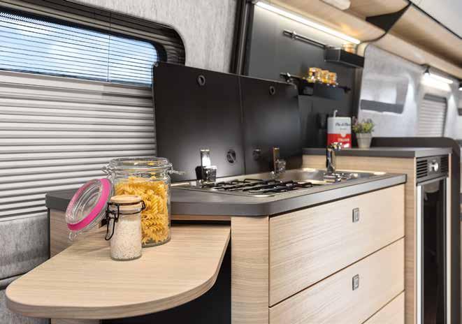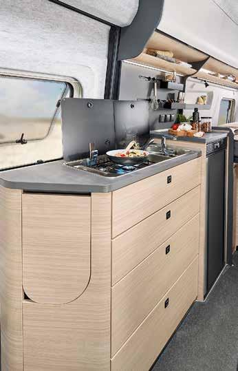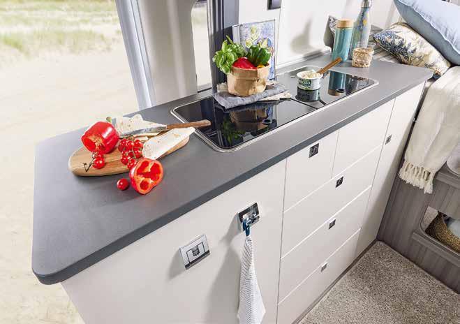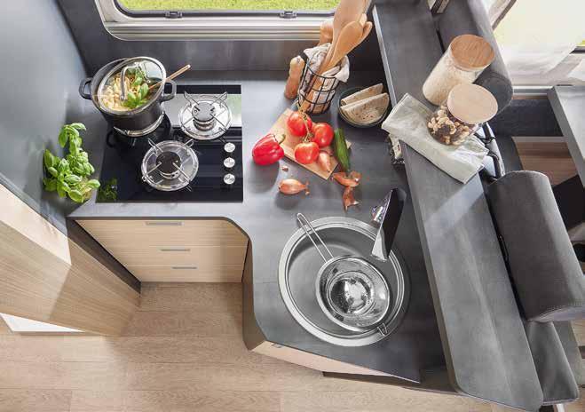 Everything must have its proper place in a mobile home. The kitchen in your Hobby has been perfectly designed for precisely this purpose. Large drawers, clever refrigerator compartments and a practical cooking and working area make the space a joy to use. Thanks to the “HobbyKomplett” ALL-INCLUSIVE package, many extras are already included from the get-go.