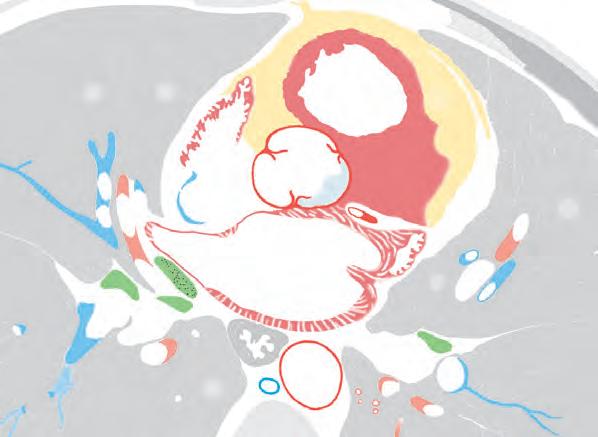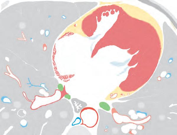 setto interventricolare (B29). Anche in questa sezione è riconoscibile la stretta contiguità tra atrio sinistro ed esofago (B9). L’aorta discendente (B17) confina a sinistra e posteriormente con l’esofago. La v. azygos (B16) si trova in posizione immediatamente anteriore rispetto al corpo vertebrale.
