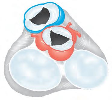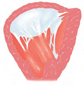 viene spinta nella via di efflusso (B). Il complesso apparato di ancoraggio delle valvole a lembi impedisce che le cuspidi vengano ribaltate nell’atrio.