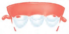 Anatomia funzionale Durante la diastole ventricolare (A), quando la colonna ematica nel tronco polmonare e quella nell’aorta esercitano una forte pressione sulle pareti vasali, le tasche si distendono, chiudendo le valvole. Il nodulo situato in corrispondenza dei margini delle tasche garantisce la chiusura. Durante la sistole ventricolare (B), quando la pressione nel ventricolo è maggiore, i margini delle tasche si allontanano l’uno dall’altro, senza peraltro accostarsi completamente alla parete del vaso a causa della formazione di vortici.