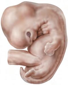 9a-12a settimana A causa del rapido accrescimento dimensionale, entro la fine della 12a settimana la LVC raddoppia. In rapporto al tronco, il collo e gli arti, in particolare quelli superiori, aumentano (A). La faccia assume tratti maggiormente caratteristici, poiché gli occhi, inizialmente collocati su un piano piuttosto laterale, migrano in direzione ventrale e gli orecchi assumono la loro posizione definitiva ai lati della testa. Le palpebre aderiscono le une alle altre, chiudendo la rima palpebrale. Entro l’11a-12a settimana, le anse intestinali collocate nel cordone ombelicale si riportano nella cavità addominale ora più spaziosa. Nella 12a settimana ha luogo il definitivo differenziamento tra organi genitali esterni maschili e femminili.