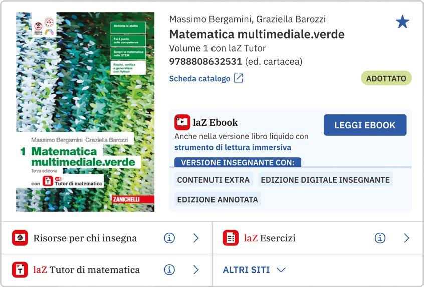La garanzia di aggiornamento è limitata alla correzione degli errori e alla eliminazione di malfunzionamenti presenti al momento della creazione dell’opera. Zanichelli garantisce inoltre che le risorse digitali di questo volume sotto il suo controllo saranno accessibili, a partire dall’acquisto, per tutta la durata della normale utilizzazione didattica dell’opera. Passato questo periodo, alcune o tutte le risorse potrebbero non essere più accessibili o disponibili: per maggiori informazioni, leggi my.zanichelli.it/fuoricatalogo