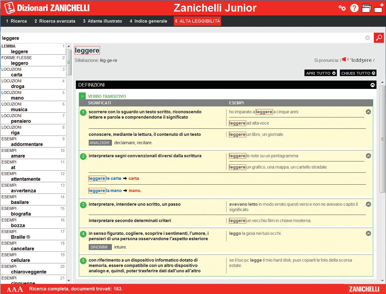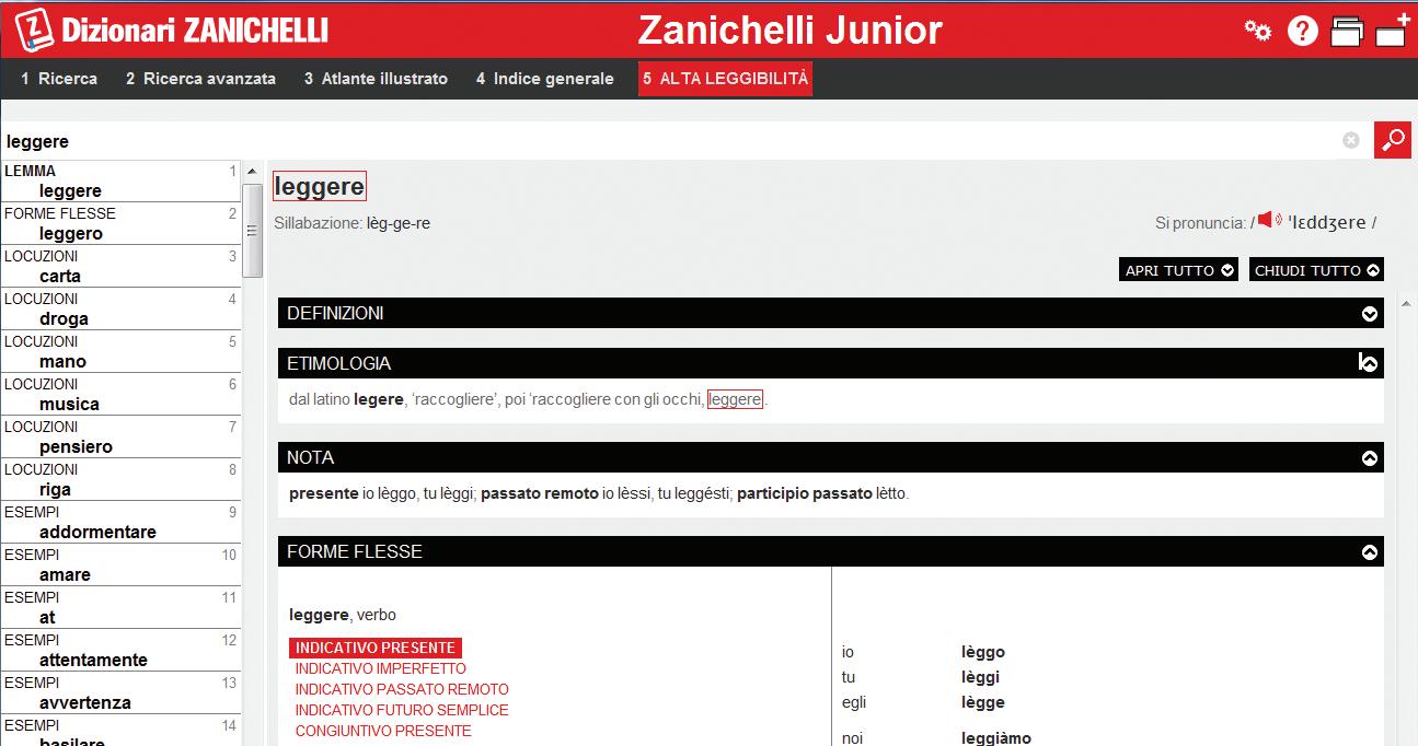 • la divisione in sillabe, la trascrizione fonematica e la lettura di tutti i lemmi, per sapere come si pronunciano le parole