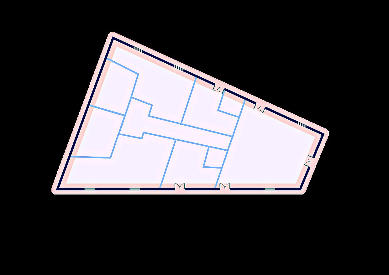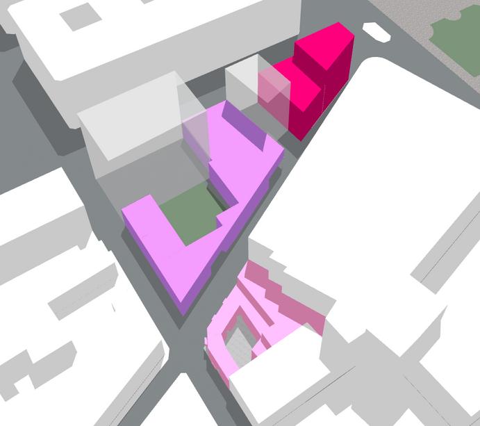 Vista en planta de la casa marrón, situado en el medio de la casa Leguía, morado, y el edificio giacoletti, fucsia De este edificio se puede conservar la fachada por el estilo neoclásico y barroco