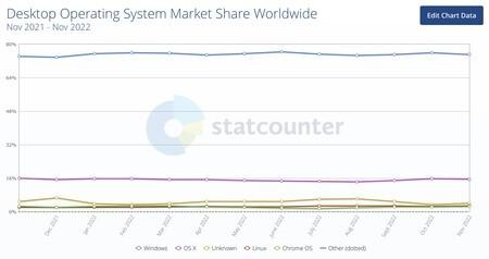 Según datos de Statcounter GlobalStats, Windows cierra el año con una cuota del 75,11%, frente al 15,6% de macOS y el 2,77% de Linux, en línea con años anteriores.