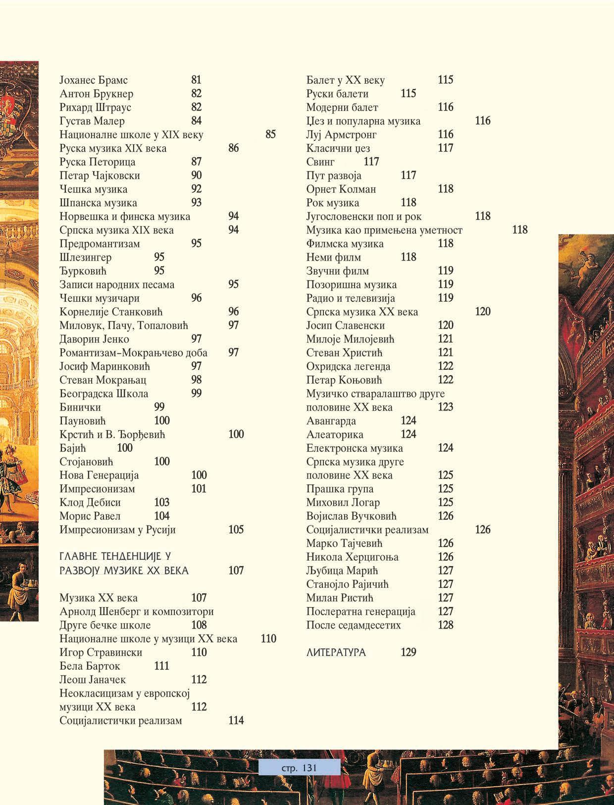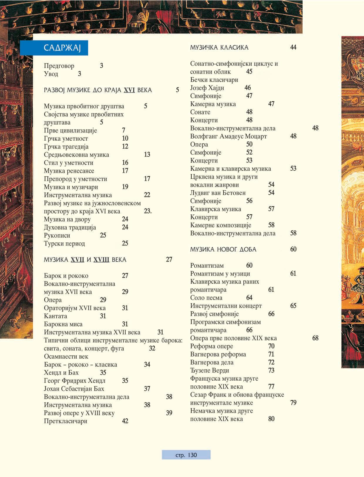 Nastava predmeta muziËka kultura predvia upoznavawe muzike kao dela sveukupne duhovne istorije ËoveËanstva. Zato se i u ovom uqbeniku prati wen razvoj kroz smenu istorijskih epoha u skladu sa podelama uobiËajenim i za druge oblasti umetnosti i kwiæevnosti. To omoguÊava da se uspostavi paralela sa srodnim tendencijama razvoja okojima se uËi u drugim predmetima, te kompleksnije stekne uvid u duhovno bogatstvo koje su nam u naslee ostavile prethodne generacije. O istorijatu muzike govori se kao o jednom znaËajnom delu duha vremena, a glavni akcenat je stavyen na prikaz i tumaËewe razvojnih linija. Detaynije su osvetyeni pojedinaËni doprinosi samo najistaknutijih liËnosti muziËke istorije, Ëija se dela i danas nalaze na repertoaru, mada je i tada izbegavano nabrajawe velikog broja Ëiwenica (detaya biografija, spiskova dela), veÊ je paæwa posveÊena tumaËewu znaËewa i znaËaja pojedinih dela u vremenu postanka, kao i u danaπwici.