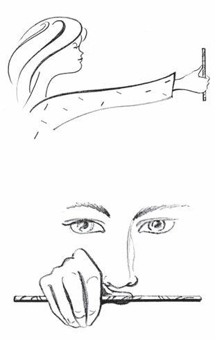 U procesu nastanka crte`a vizirawe ima najva`niju ulogu. Vizirawe je merewe sa distance, sa fiksiranog mesta pomo}u olovke ili {tapi}a, a koristi se i visak (gumica za brisawe zavezana za du`u nit konca). Meri se uvek potpuno ispru`enom rukom ({to upotpuwuje fiksirano mesto posmatrawa). [tapi} ili olovka se dr`i u vertikalnom polo`aju (proveriti viskom) ili horizontalnom (paralelno sa o~ima). Visina se odmeri na {tapi}u palcem, zatim se u horizontalnom polo`aju na isti na~in odredi {irina, uporede se veli~ine, dobije se wihov odnos, koji je uvek isti bez obzira na veli~inu formata crte`a. Vizirawe je merewe i upore|ivawe – nala`ewe odnosa koji su najbitniji u definisawu oblika. U na{em primeru, vizirawem smo dobili podatke da je {irina oblika jednaka tre}ini wegove visine. U procesu crtawa mo`emo da uzmemo bilo koju dimenziju kao po~etnu, i za wu bilo koju veli~inu. Bitno je da je wihov odnos u na{em slu~aju 1>3. Oblik koji crtamo je izdu`en i vertikalno postavqen. List papira na kome se crta je pravougaon, a postavi se tako da su mu kra}e strane horizontalne. Vertikalnom linijom odredimo sredinu