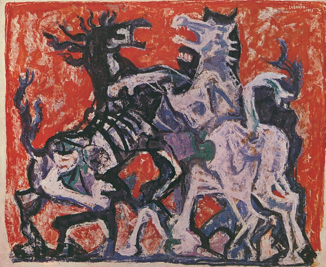 U intimisti~kom krugu beogradskih slikara posebno mesto ima Petar Lubarda. Tu posebnost odre|uje dramska prisutnost na wegovim slikama, bilo da je re~ o stenovitom kr{u crnogorskih pejza`a, bilo o mrtvim prirodama. Na mrtvoj prirodi Zaklano jagwe, sa prosutim crevima i lepqivom krvi, Lubarda kao da naslu}uje tragediju i `rtvu ~oveka u Drugom svetskom ratu, a u kamenim pejza`ima Crne Gore, naslikanim svetlo{}u i senkom u gustoj pasti, ose}a se osamqenost, ne{to iskonsko, bezvremeno, vreme u kome je sve bilo samo kamen i voda. Taj dubqi sadr`aj koji slikar daje predmetima ~ini da oni prerastaju u arhetipske slike i simbole.