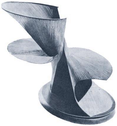 bronzi. Spiralne povr{ine, ponekad linearno obra|ene, okru`uju prostor i stvaraju svojim levkastim oblicima iluziju dinamizma. Naum Gabo se, me|utim, interesovao za prozirne plasti~ne mase kao materijale svojih konstrukcija. Delo izra|eno od sinteti~nog konca, razapetog izme|u plasti~nih povr{ina, obrazuje slo`enu mre`u niti kroz koje struji vazduh. Lako}a i svetlina prozirnih povr{ina omogu}avaju pro`imawe unutra{weg i spoqa{weg prostora.