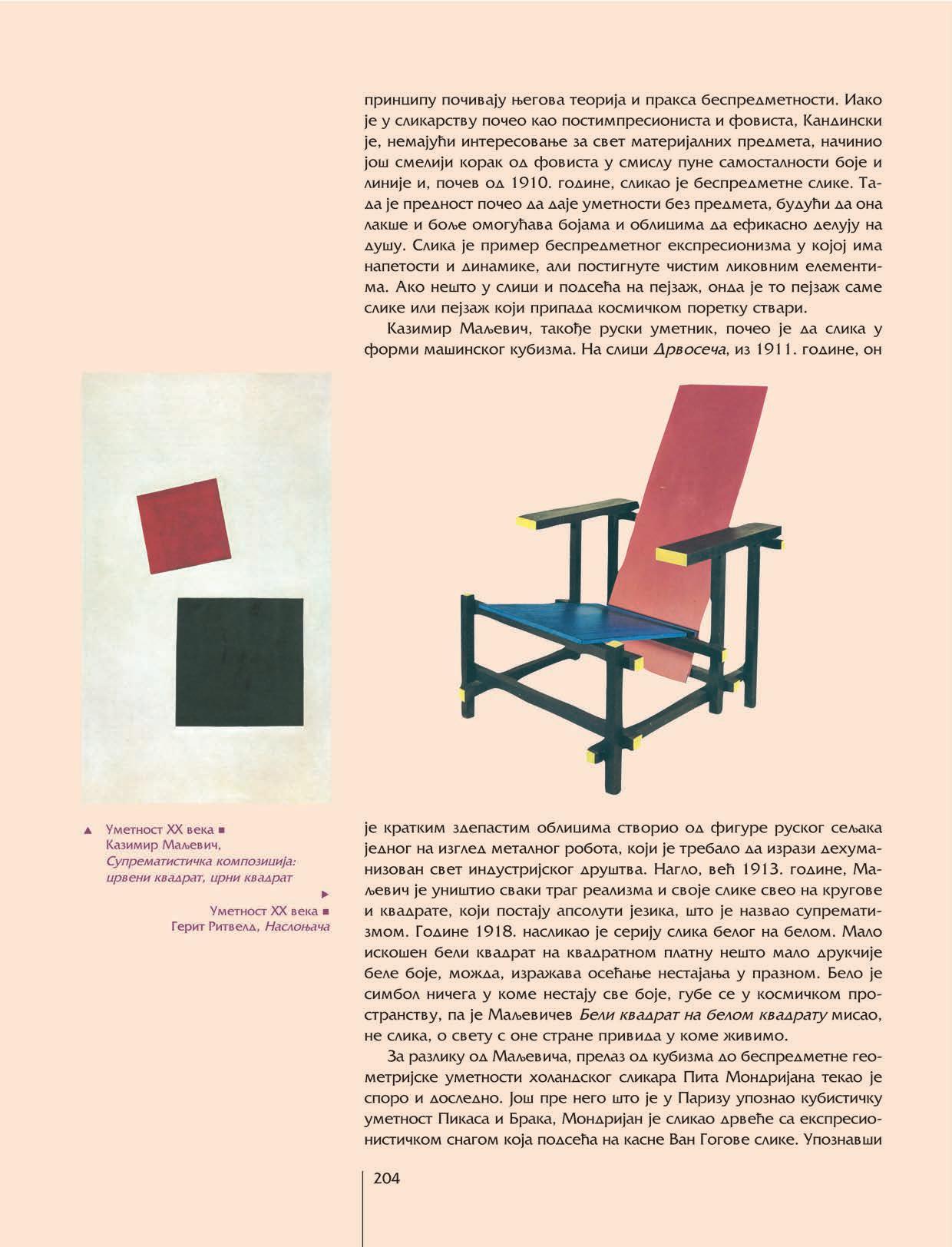 Proces o slici kao samostalnoj stvarnosti koja ima svoje zakone izgradwe, nezavisne od spoqa{we stvarnosti, koji su zapo~eli impresionisti krajem XIX veka a nastavili Van Gog, Gogen, fovisti i ekspresionisti, zavr{en je stvarawem bespredmetne umetnosti. Wu su izme|u 1910. i 1920. godine stvorila, nezavisno jedan od drugog, tri umetnika – Vasilij Kandinski, Kazimir Maqevi~ i Pit Mondrijan.