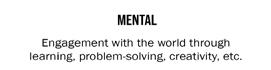 Wellness encompasses 8 mutually interdependent dimensions: physical, intellectual, emotional, social, spiritual, vocational, financial, and environmental. Attention must be given to all the dimensions, as neglect of any one over time will adversely affect the others, and ultimately one’s health, well-being, and quality of life. They do not, however, have to be equally balanced. We should aim, instead, to strive for a “personal harmony” that feels most authentic to us. We naturally have our own priorities, approaches, and aspirations, including our own views of what it means to live life fully.