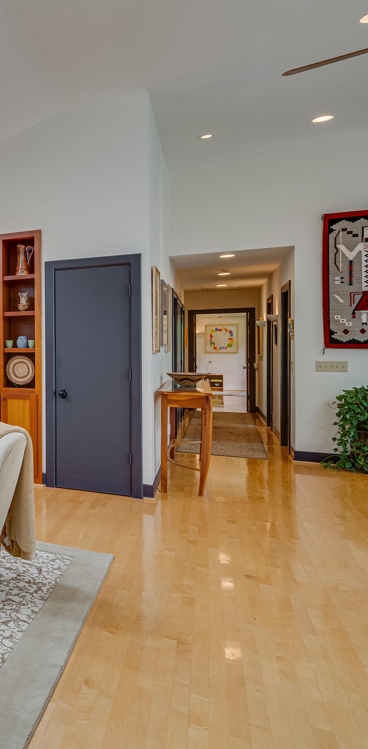 • Two sets of French doors lead to the expansive stone front porch with winter-time city views