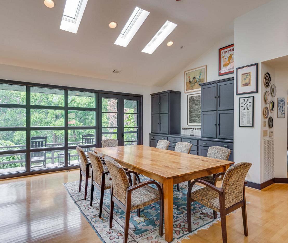 • Great room details include built-in speakers, 10 skylights, a Gas Fireplace, a lovely wall of windows and access to front and back porches