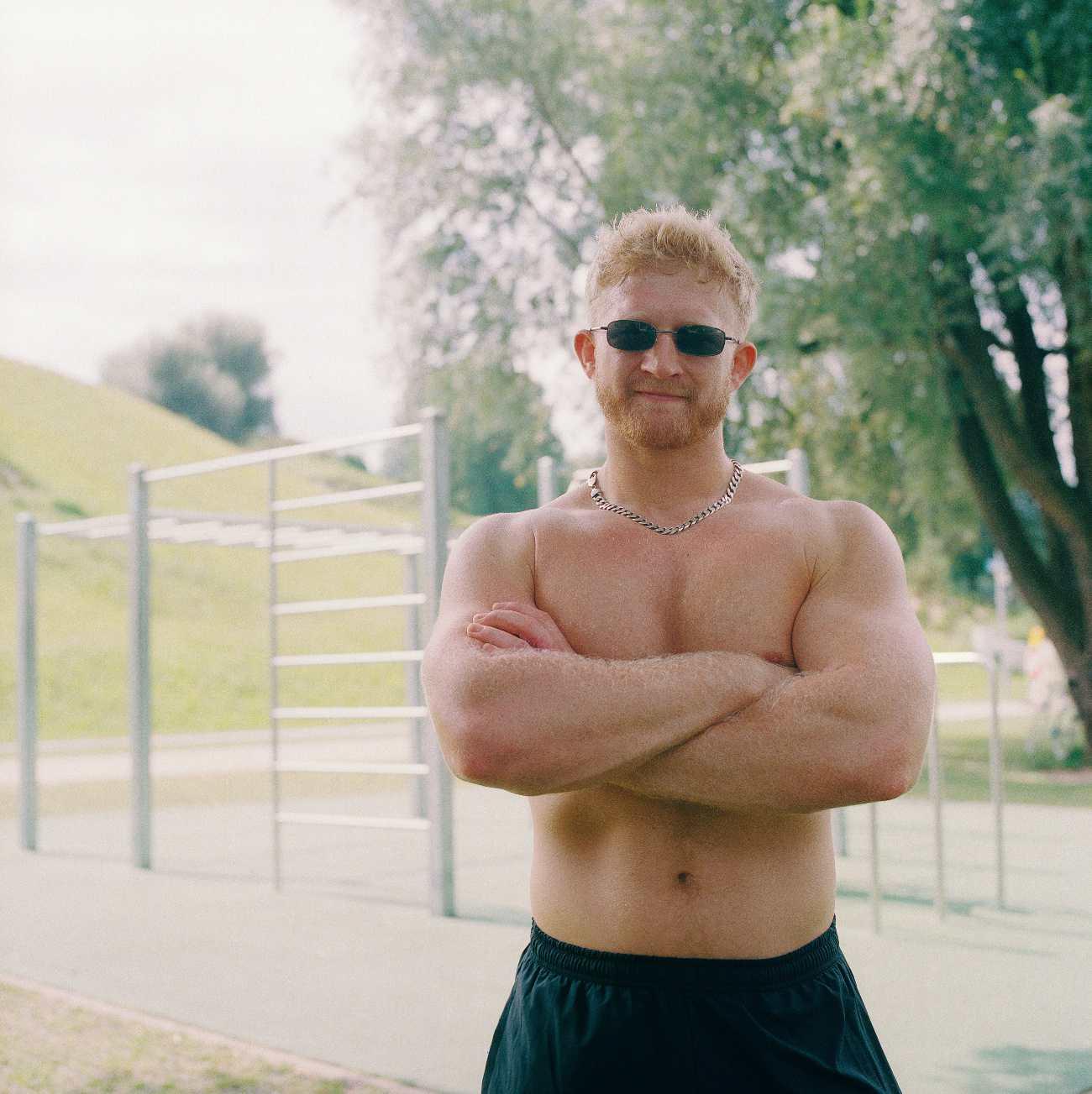 Klimmzugstangen wie in Venice Beach: Charlie vor dem Calisthenics Park beim Olympiastadion. Vorige Doppelseite: Der Skatepark am Hirschgarten in Nymphenburg; Litfaßsäule vor dem Cinema in der Maxvorstadt, das Filme nur in der Originalversion zeigt